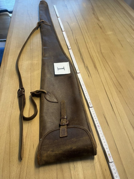 gute erhaltenes Lederfutteral aus Dickem braunen Leder. Leder hat Gebrauchsspuren aber ist nicht brüchig udn alle Nähte sind in Takt. Länge ca 120cm, Breite hinten ca 18cm.