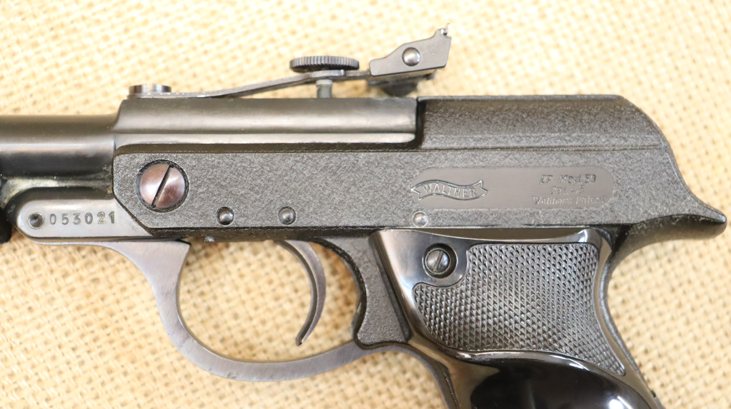 Gebrauchte Luftpistole von Walther. Die Pistole ist vor 1971 gefertigt und hat noch kein F im Fünfeck, aufgrund des Baujahres ist sie frei ab 18 Jahre erwerbbar. Produktsicherheit/Hersteller