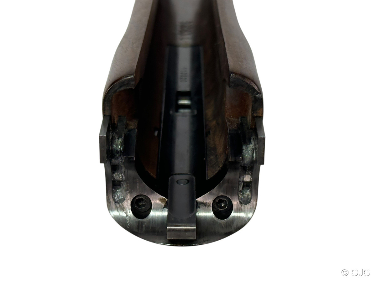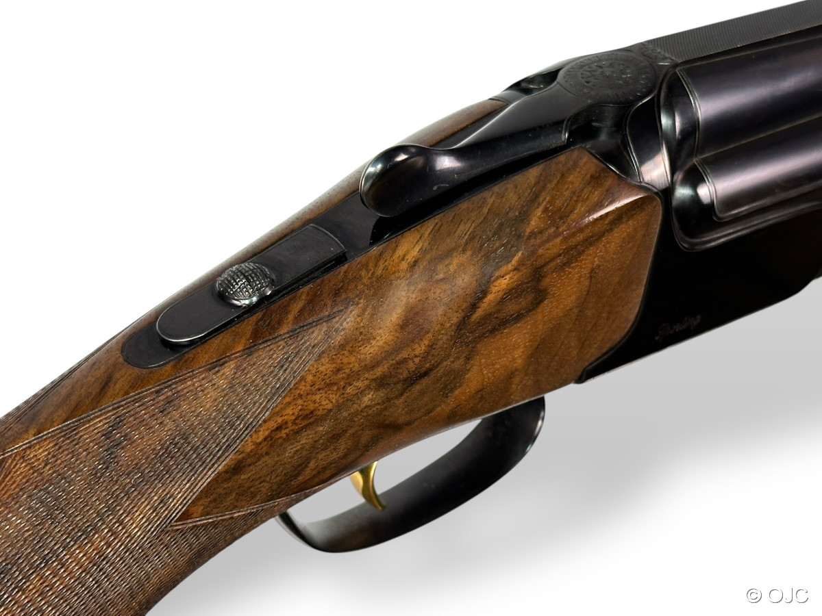 Es handelt sich um eine Vorführwaffe aus unserem Geschäftseigentum. Unser Geschäftsführer nutzte diese Waffe zu Präsentationzwecken auf umliegenden Schießständen. Dementsprechend wurde die Waffe stets in unserer Büchsenmachermeisterwerkstatt gewartet bzw. gereinigt. Es handelt sich NICHT um eine "ausgeschossene" Waffe, deren Zenith erreicht ist! Natürlich hat sie ein paar Gebrauchsspuren in Form von kleinen Kratzern im Schaftholz, marginalem Brünierungsabrieb, etc... die Waffe ist dicht, die Läufe sind blank. Basküle und Patronenlager machen einen sehr guten Eindruck. Siehe Fotos und Detailaufnahmen.