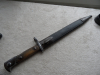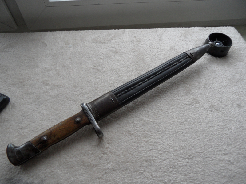Bajonett G 84/98 Die Griffschalen aus Holz gefertigt, kleine Fehlstellen im Holz. Der Druckknopf funktioniert, Auf der Parierstange mit Truppenstempelung . Die Klinge blank mit Gebrauchsspuren, Hersteller Markierung "Weyersberg Kirschbaum & Co, Solingen" Preussische Abnahmestempel . Die frühe Lederscheide nicht zugehörig, aber sie passen zusammen, der obere Beschlag mit Truppenstempelung. Aber Bitte seht Fotos