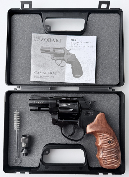 Kaliber: 9mm R.Knall System: Gas- Signal Magazin-Kapazität: 6 Schuss - Trommelmagazin Gesamtlänge: ca. 180mm Lauflänge: 2,5 Zoll Gewicht: 730g Abzug: Single- und Double-Action Visierung: Kimme und Korn Sicherung: Manuell Material: Metall / Holz Griffschalen: Holzoptik Farbe: schwarz / braun Hersteller: Zoraki