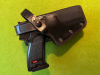 Holster aus dickem, sehr stabilem teils lederüberzogenen Cordura, Steg aus Kydex, sehr stabil, das ganze ist Rechtshand am Bund oder an einem geeigneten Koppel tragbar