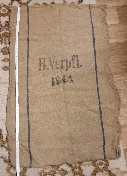 Originaler Versorgungs- oder Verpflegungssack der Wehrmacht, in diesem Fall wohl des Heeres mit der Aufschrift „H Verpfl. 1944“. Auf der Rückseite ein Adler.