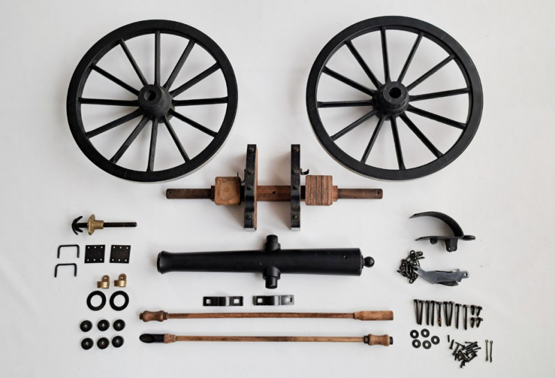 Zur Versteigerung kommt hier ein großes Teilekonvolut von einer Napoelon Kanone im Kaliber .69 aus spanischer Dikar Fertigung Das Konvolut besteht aus allen auf den Bildern zu sehenden, gebrauchten Teilen wie einem Kanonenrohr,(ca. 385 mm lang, mit Beschuss, der Beschuss ist aber vermutlich nicht mehr gültig, an der Unterseite ist das Kanonenrohr etwas zerkratzt.) zwei Speichenrädern (Durchmesser 320 mm aus einer Leichtmetalllegierung), zwei Seitenteilen mit den Beschlägen, der kompletten Achse, zwei Ladestöcken so wie diversen Beschlag- und Kleinteilen aus Stahl und Messing sowie Holzschrauben (brüniert) mit Vierkantkopf, Unterlegscheiben usw. Alle Teile des Konvolutes befinden sich in einem guten Zustand (siehe Bilder) mit Gebrauchsspuren und kleineren Oxydationsspuren.
