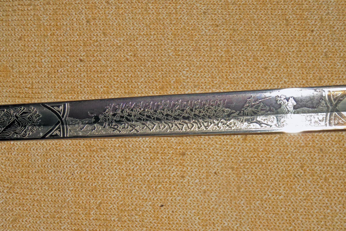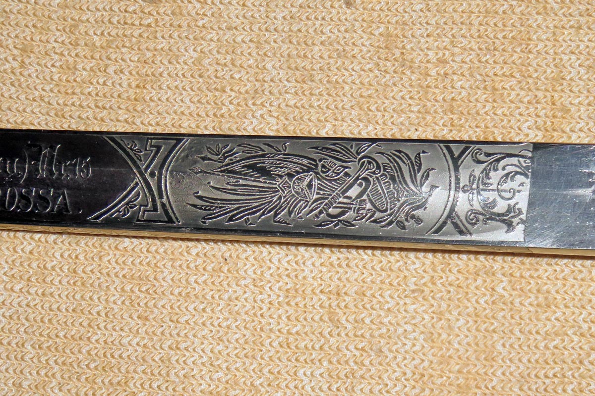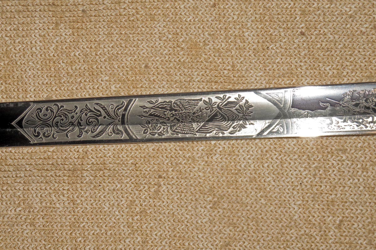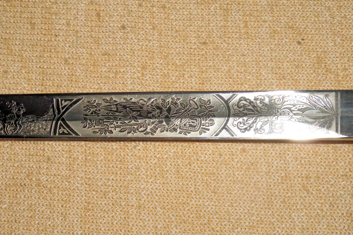 Die Rückenklinge ist beidseitig aufwendig geätzt mit Ornamentik, Trophäenmuster und Regiments-Inschrift (siehe Bilder).