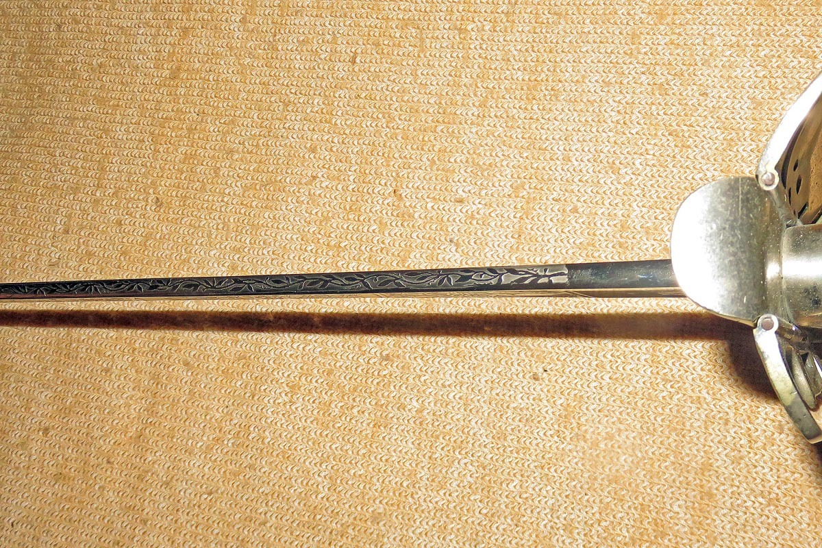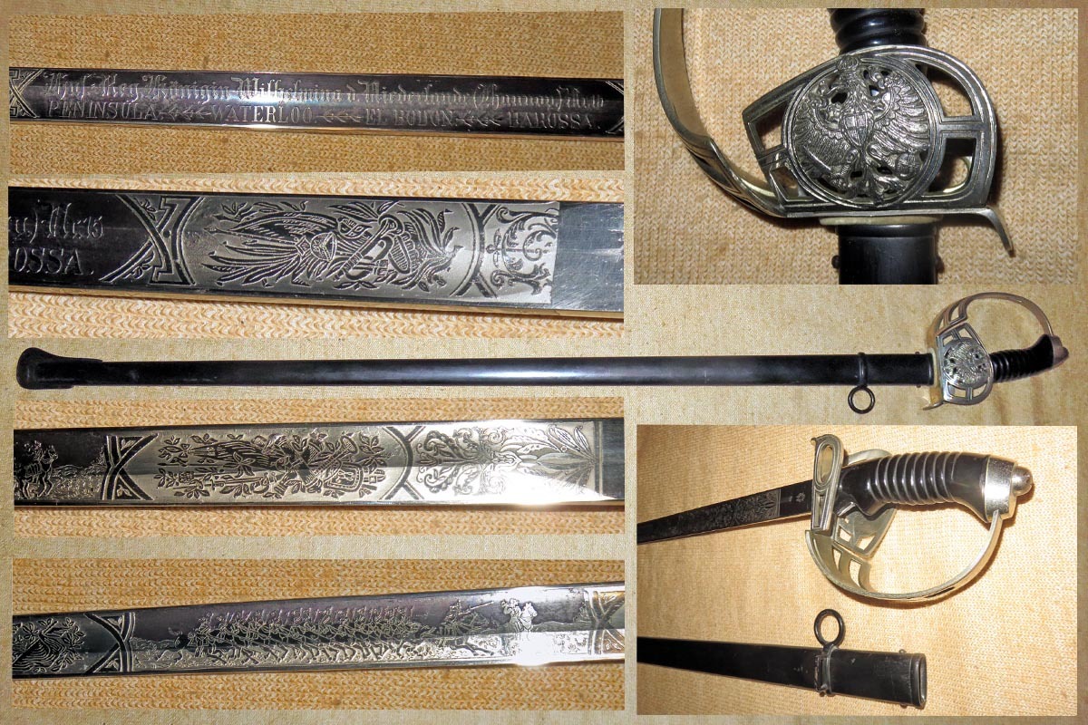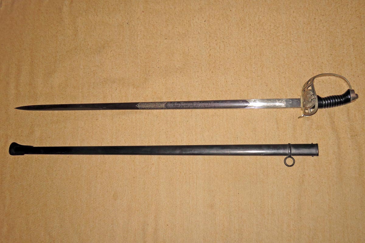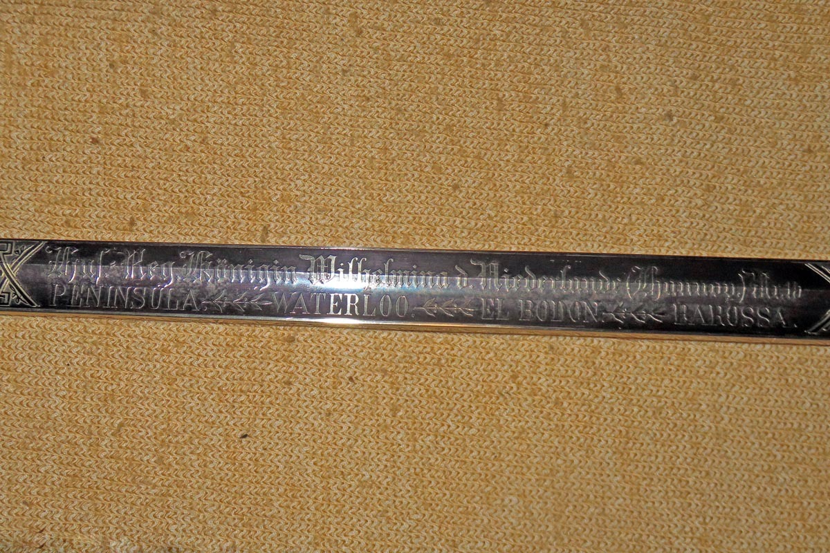 Die Rückenklinge ist beidseitig aufwendig geätzt mit Ornamentik, Trophäenmuster und Regiments-Inschrift (siehe Bilder).