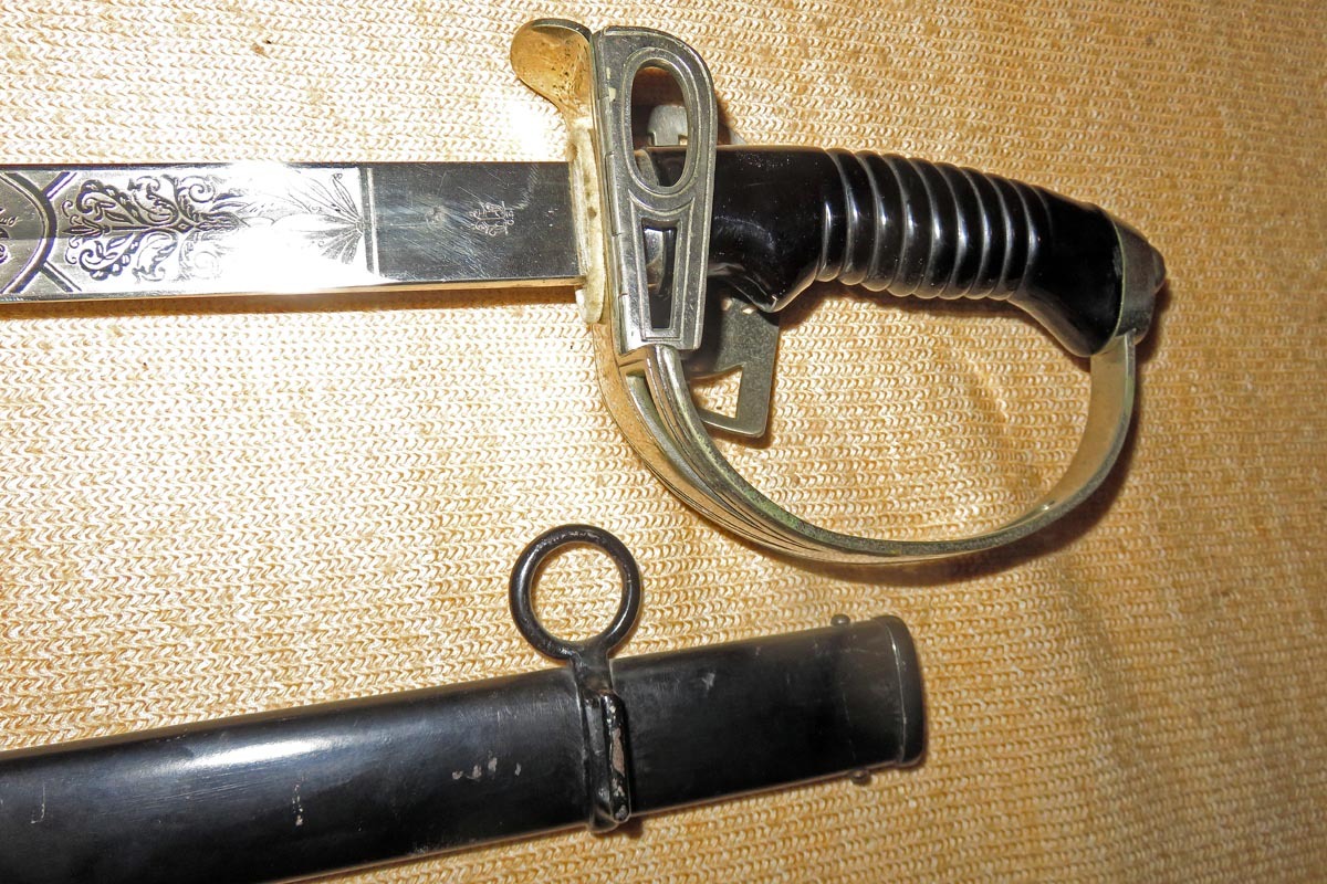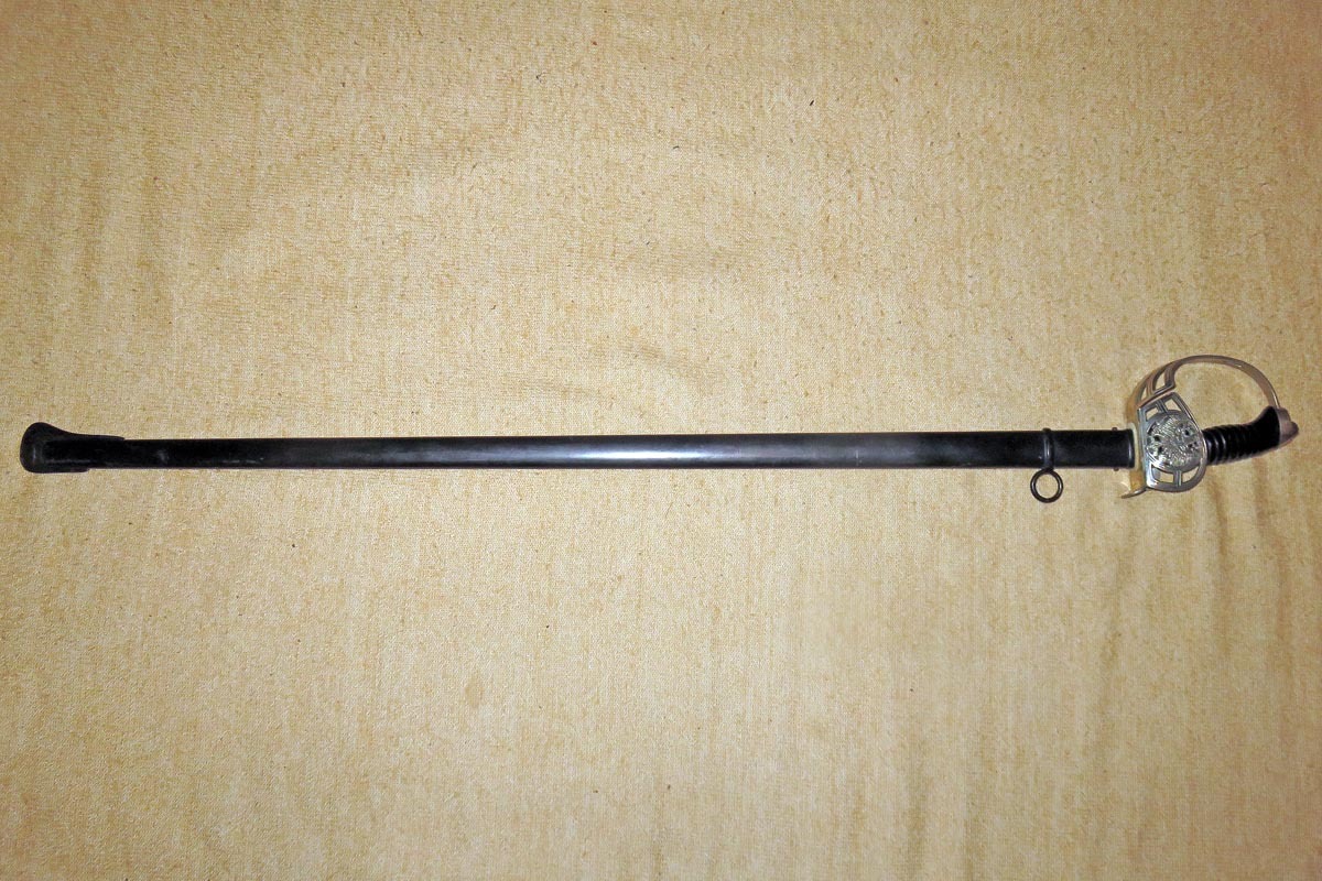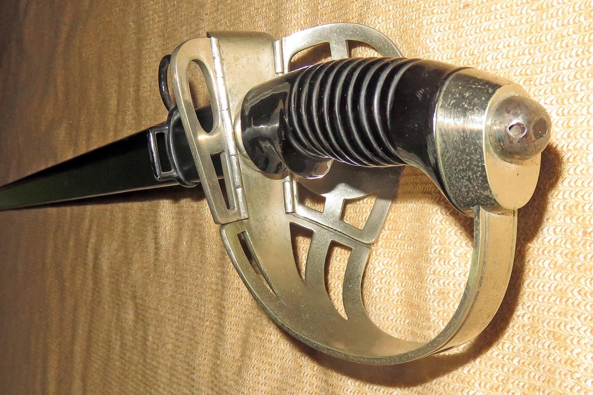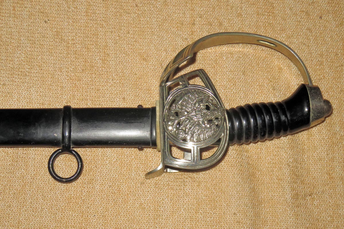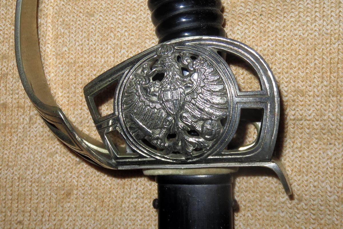 Der preußische Degen hat ein Bügelgefäß mit integriertem Wappen und beidseitigem Klappscharnier, sowie einen schwarzen Griff aus Bakelit.