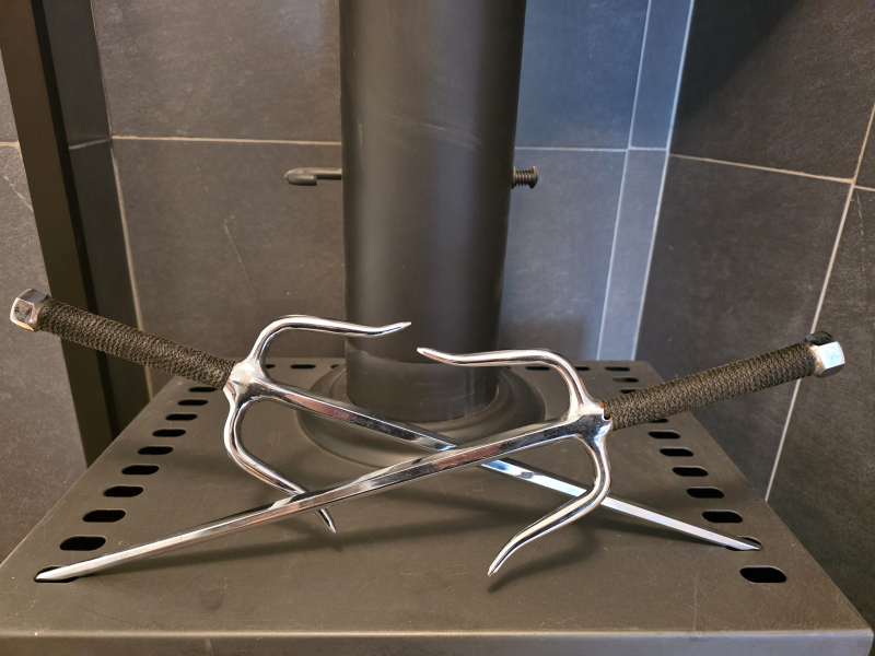 Sai Gabeln chrom 54,5 cm Sai-Gabeln mit Siegs eckigem Profil. Verchromt. Maße (eine Sai-Gabel): Länge 54,5 cm = Gewicht ca. 740 g, 2 Stück.