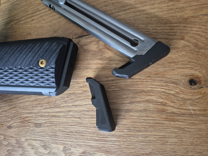 Es ist ein verlängertes Magazinboden für Ruger Mark IV 22/45 Kurzwaffen. Das Magazin schaut ca. 3mm aus dem Magazinschacht raus, was das Einführen einfacher und angenehmer macht. Das Magazin rastet somit ein ohne dass dieses mit dem Daumen nachgedrückt werden muss. Wechsel in 10 Sekunden möglich. Keine Änderung an der Kapazität des Magazins.