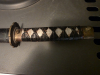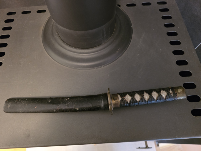 Geschärftes Katana (Dolch) aus rostfreiem Stahl. Edle Ausführung mit Verzierungen in kupferfarbenem Antikfinish, inklusive schwarzer Holzscheide mit elegantem Glanzlack; Grief Länge 14 cm (Gesamt 37,5 cm), Klingenlänge 22 cm.