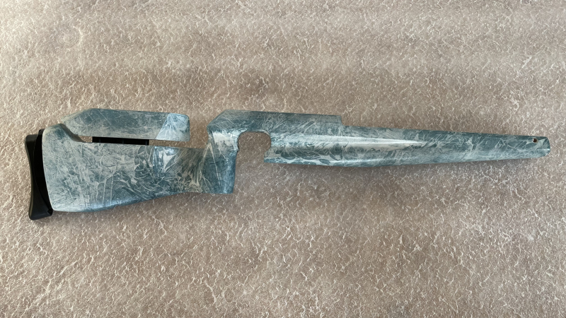 Der Schaft wurde mit einer speziellen Technik zweifarbig gebeitzt und mit Klarlack versiegelt. Schaftkappe, UIT-Schiene und Gewichtsplatte sind mit dabei.