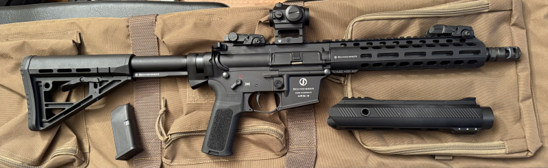 Zum Verkauf kommt eine Selbstladebüchse der Firma Schmeisser AR15-9 Sport, 10,5 Zoll im Kaliber 9mm. Sie wurde am 10.10.25 von mir neu erworben. Kaufbeleg liegt bei, somit noch reichlich Restgarantie. Der montierte M-Lock Handschutz und der beiliegende geschlossene Handschutz sind beide Teil des Angebots, somit kann die Büchse jederzeit für Jäger bzw Sportschützen umgebaut werden! Eingetragen in der Wbk als Sportversion, wichtig für Sportschützen! Sie hat eine Schussbelastung von genau 165 Schuss. Sie ist mit einem Norec-Kompensator ausgestattet und hat nur minimale Gebrauchsspuren (s .Fotos). Aufgrund der Option des Handschutzwechsels ist sie für Jäger und Sportschützen verwendbar. Sie kommt im Originalkoffer mit dem abgebildeten Zubehör, das Rotpunktvisier ist nicht Teil der Auktion. Sie wird mit einem 10 Schuss Magazin geliefert. Der Versand erfolgt nach Absprache mit Overnite. Erwerb natürlich nur mit gültiger EWB! dieses ist ein Privatverkauf ohne Garantie, Gewährleistung, Rücknahme oder Umtausch! Viel Spaß beim bieten