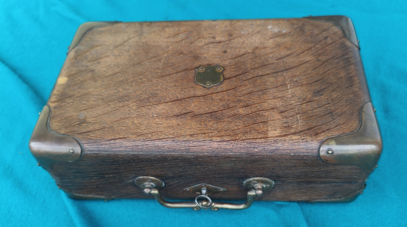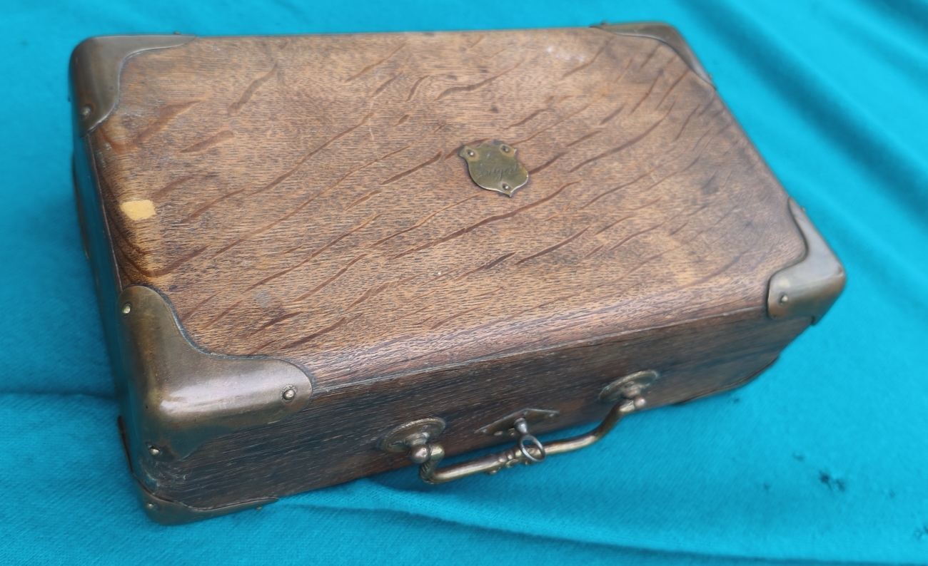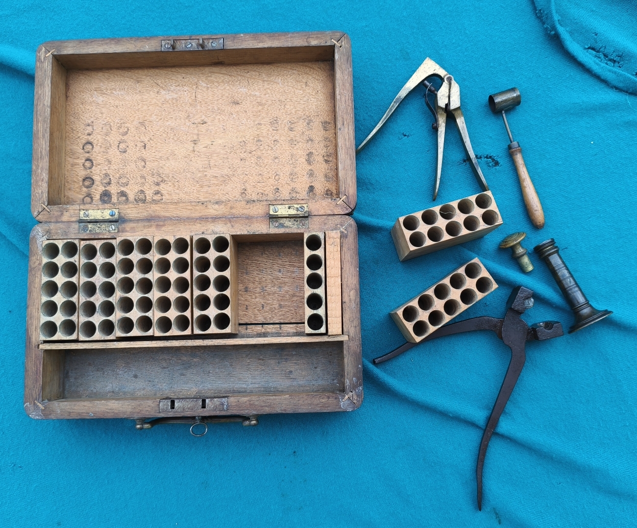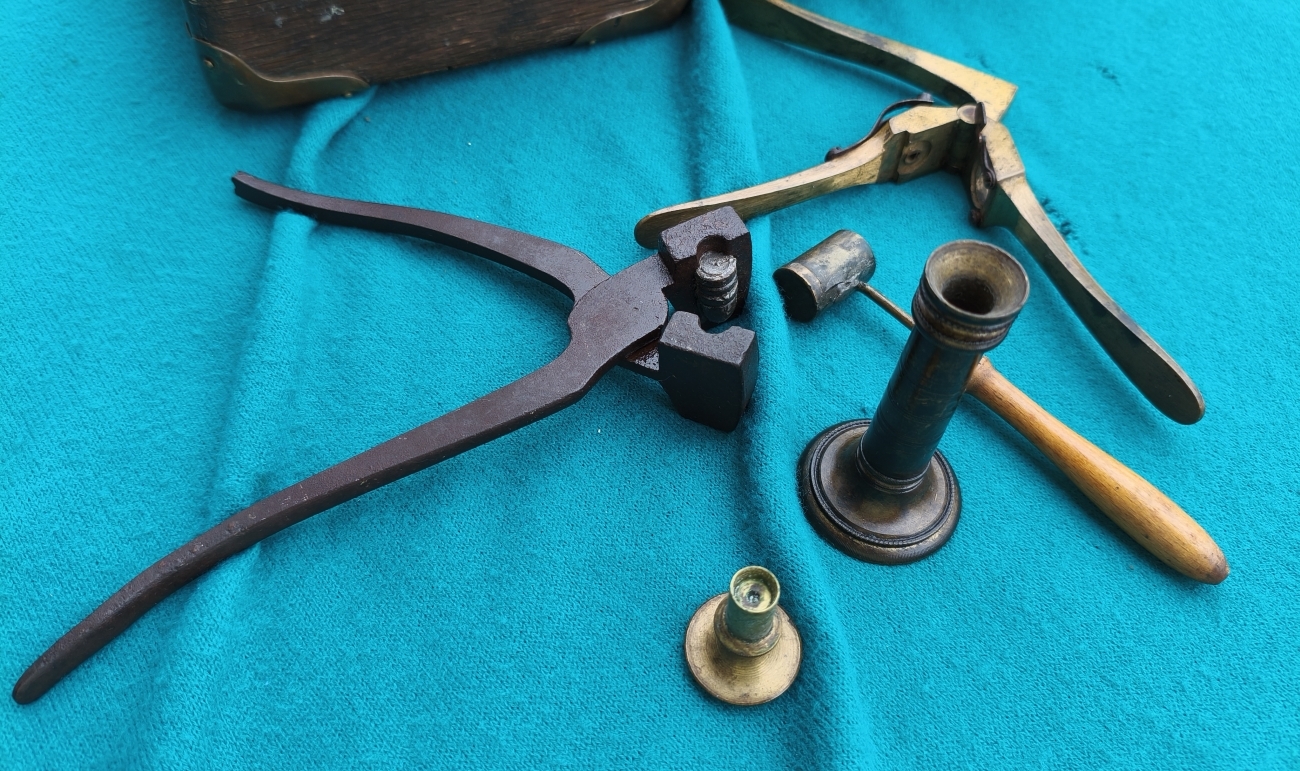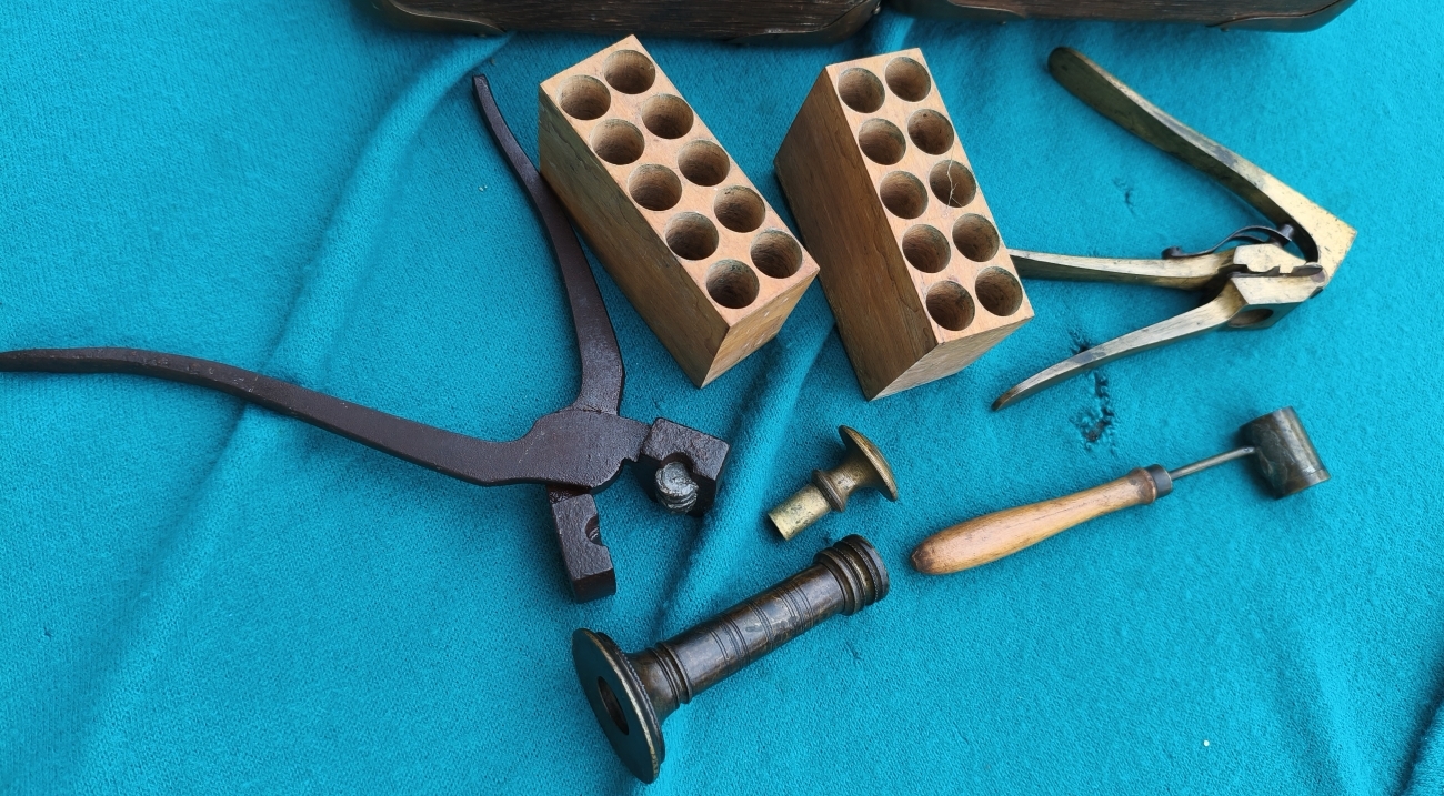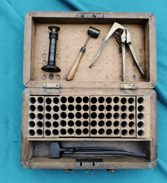 Eichenkasten mit Schloß & Schlüssel. Patronenklötze (Bohrungen circa 13,06). Entzünderzange Messing (circa 13,2mm). Geschosskugelzange (circa 11,5mm am oberen Ring), zur besseren Handhabung gebogen. Pulvermaß sowie Geschosssetzer (Öffnung circa 13,3mm). Maße Kassette 27x16x9cm.