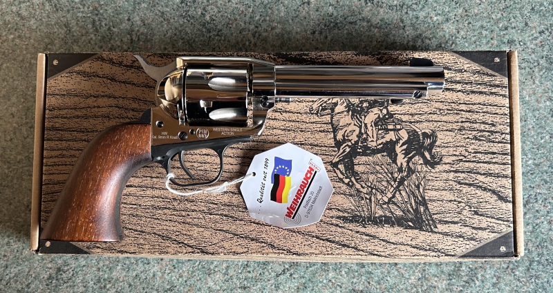 Hallo Sammler, verkaufe hier aus meiner Sammlung einen Western Single Action Revolver 9 mm Knall mit der PTB Nr.883 Chrome Ausführung mit Originalverpackung Handschuhe und Putzbürste sowie Gebrauchsanweisung. So wie auf dem Foto der Revolver wurde nicht beschossen und wird auch nicht mehr hergestellt beziehungsweise verkauft. Da Privat Kauf keine Garantie und Rücknahme sollten noch Fragen sein oder Fotos benötigt werden beziehungsweise Sofortkauf bitte melden. Viel Spaß beim bieten. Artikel wird mit DHL versichert und mit Sendernummer verschickt.