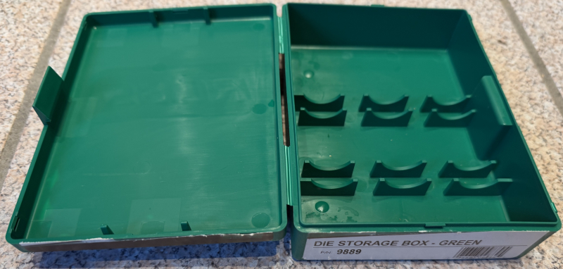 Angeboten wird eine wenig benutzte RCBS Die Storage Box - Green 9889 (Matrizenbox leer).