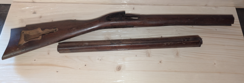 Schaft eines alten Vorderladergewehres, im Vorderen Teil ist das Holz gerissen, wird als defekt angeboten