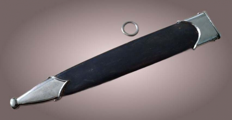 Dienstdolch Schwarz brünierte Scheide. Bleigewicht ist drin. Gesamtgewicht ca. 171 Gramm. Tragering ist ab (sehe Foto). Sonst in gutem Zustand. Ersatz Ring zum anbringen liegt bei. Beschläge magnetisch und vernickelt. Sie bieten auf das was Sie sehen ohne Garantien und Rücknahme.