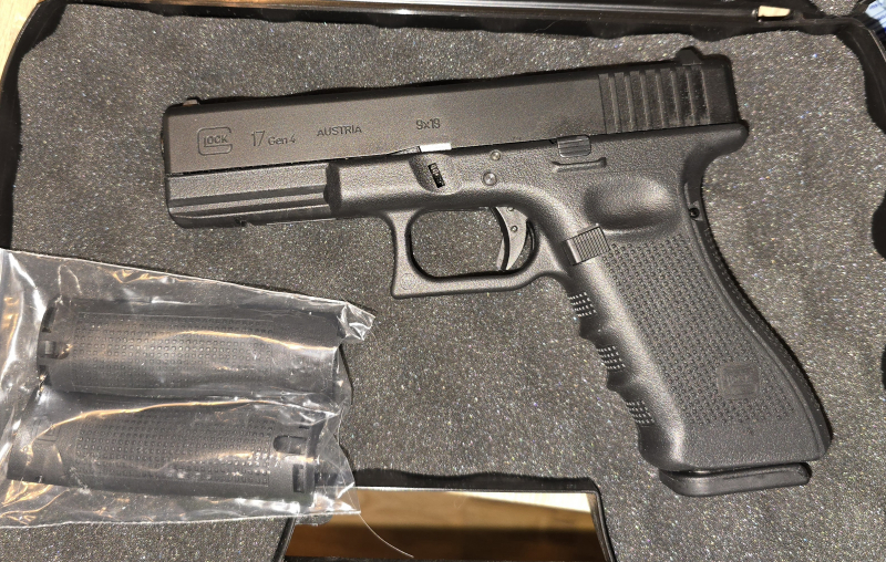 Hallo, biete hier eine Glock 17 Gen 4, 6mmBB, Gas an, in schwarz. Die waffe hat Blowback, hat keine gebrauchspuren, waffe ist aus Metall mit Polymer Body, sie ist dicht und hat ein F zeichen. Mit dabei ein Waffenkoffer und wechselgriffrücken. Was aussieht wie Flecken auf der waffe sind nur Öl Spuren von der Pflege. Waffe ist nur probe geschossen, zwecks funktion und Dichtigkeit.