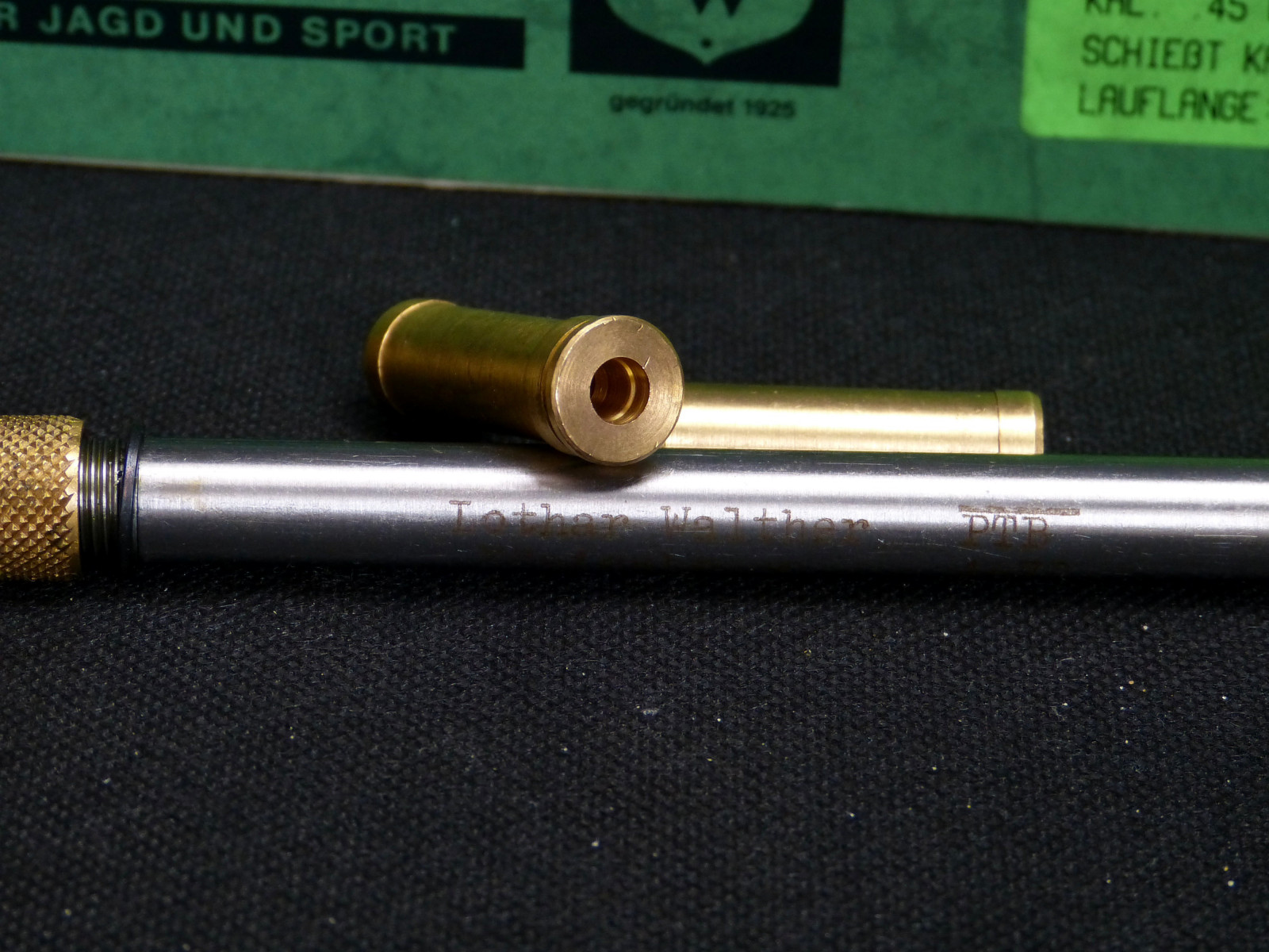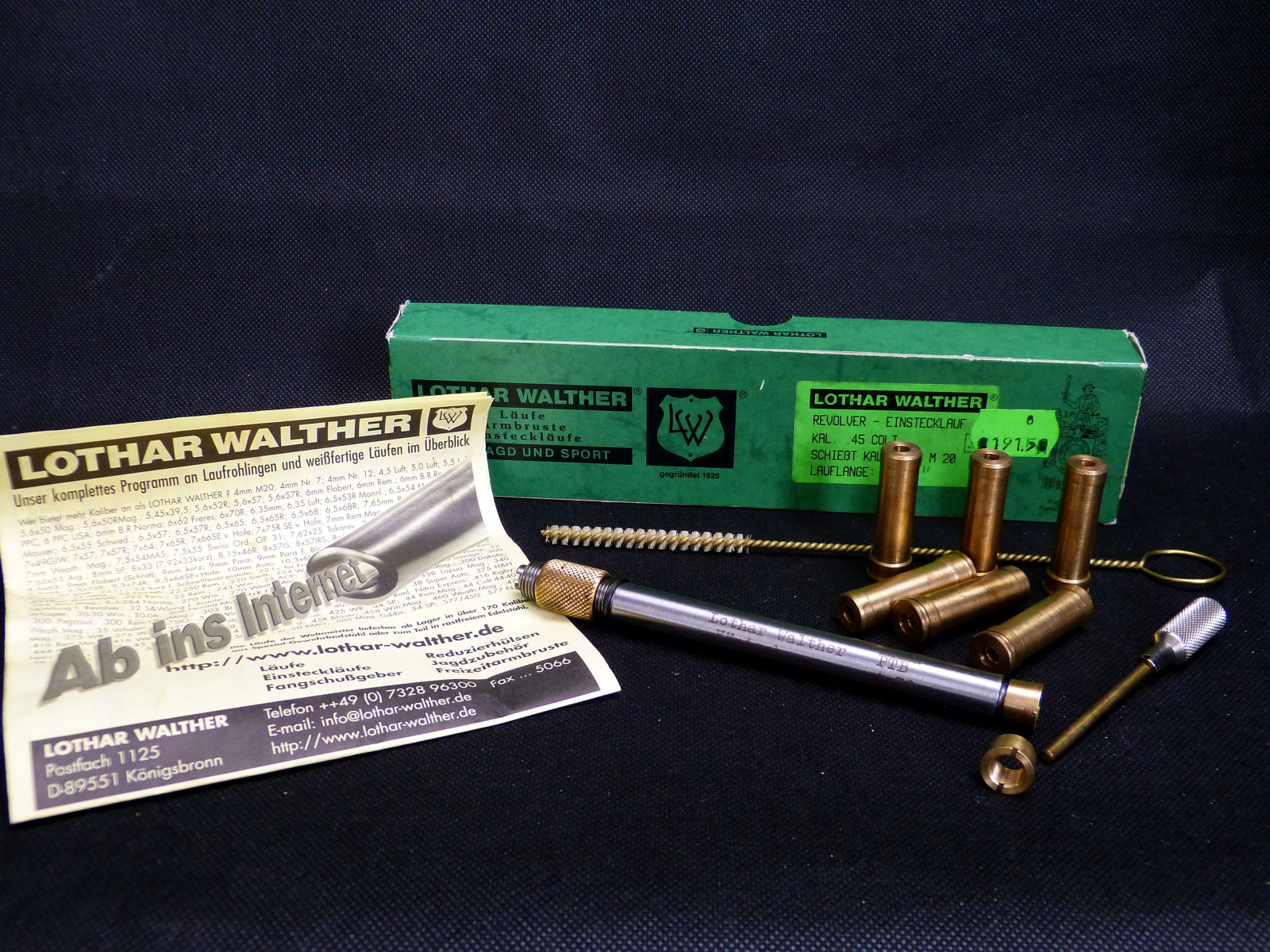 Sehr guter (ungebrauchter?) Zustand in der originalen Box. Geeignet für eine Lauflänge von 4 5/8 Zoll. Inklusive 6 Ladepatronen, und zwei Konus Stücke für die trommelseitige Fixierung.