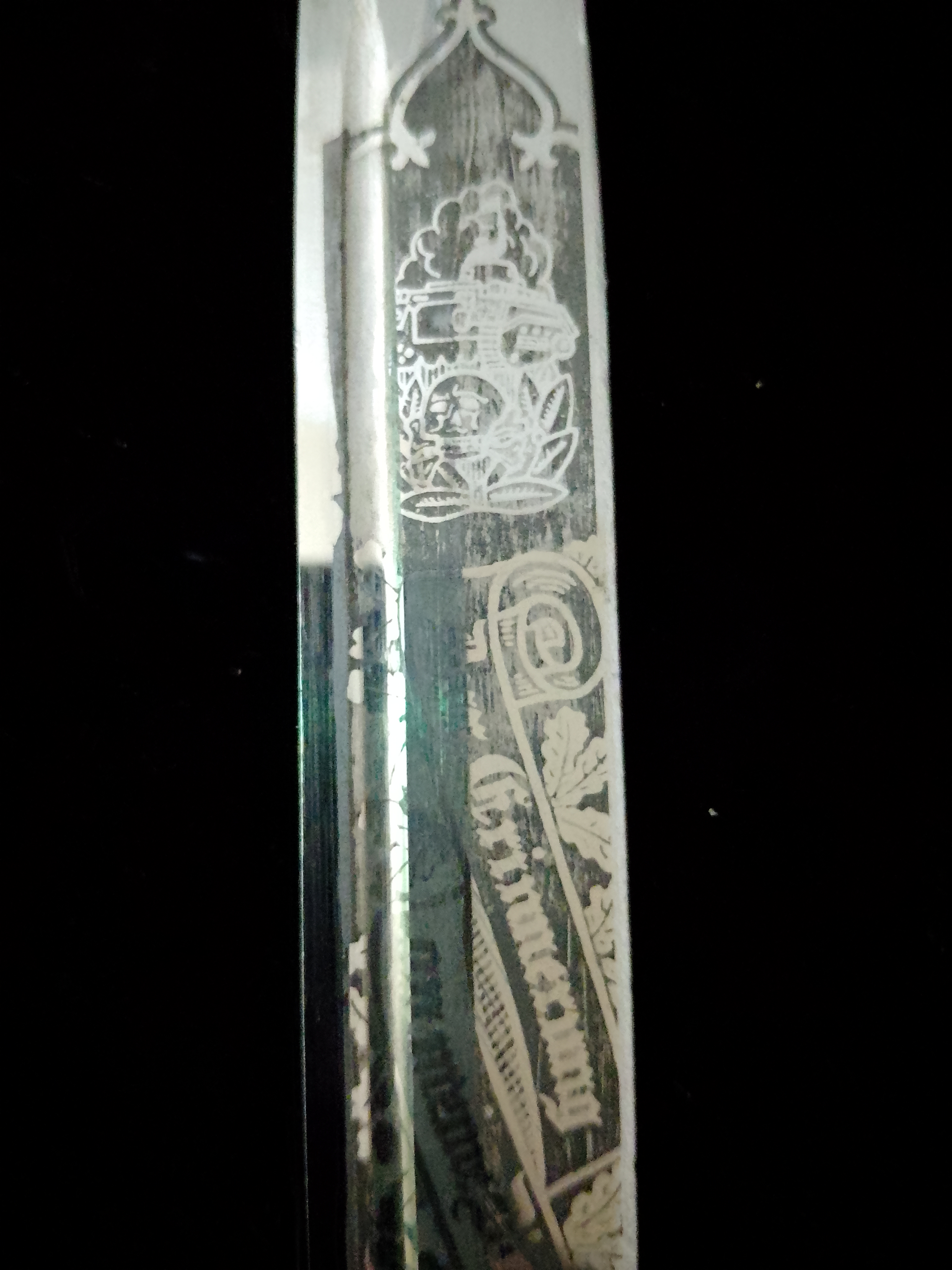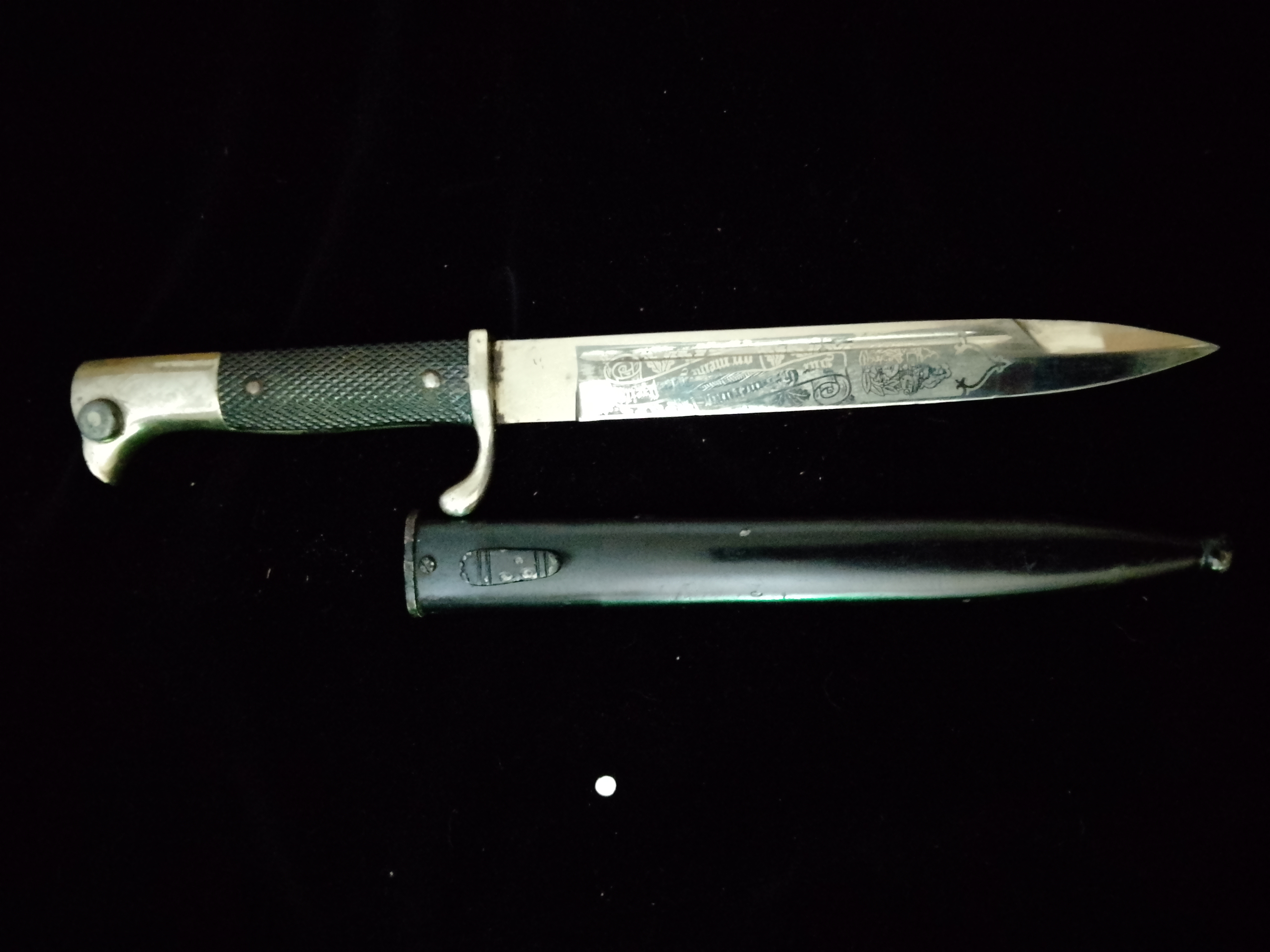 Ausgeh Bajonett der Firma Eickhorn Solingen, kurze Ausführung mit Ätzung für die Panzertruppe, Achtung Klinge etwas berieben und beschliffen, daher Ätzung an der Schneide etwas auspoliert.