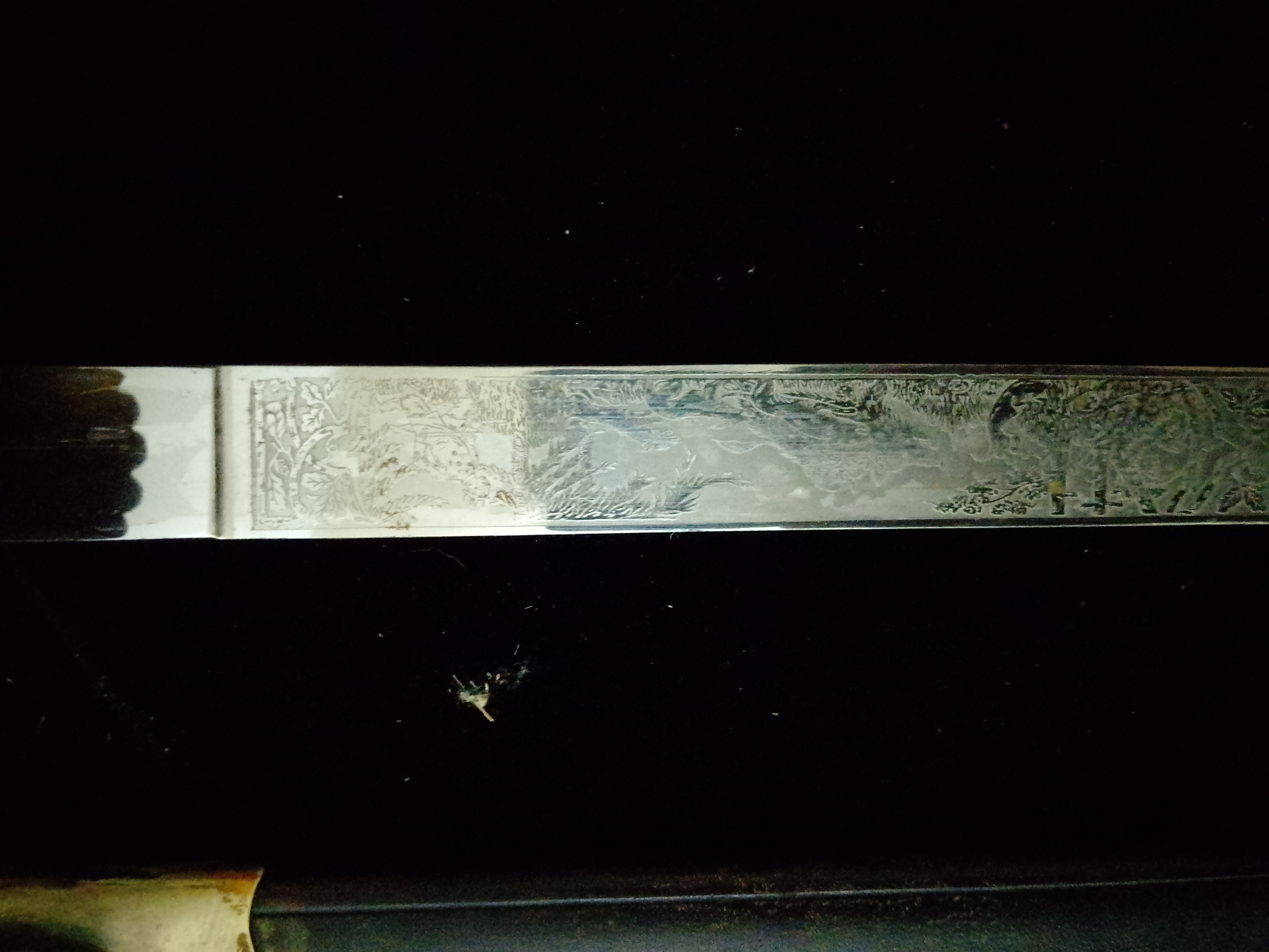 Dreiseitig geätzte Klinge mit sehr schönen Jagdmotiven und dem Hörster Logo.