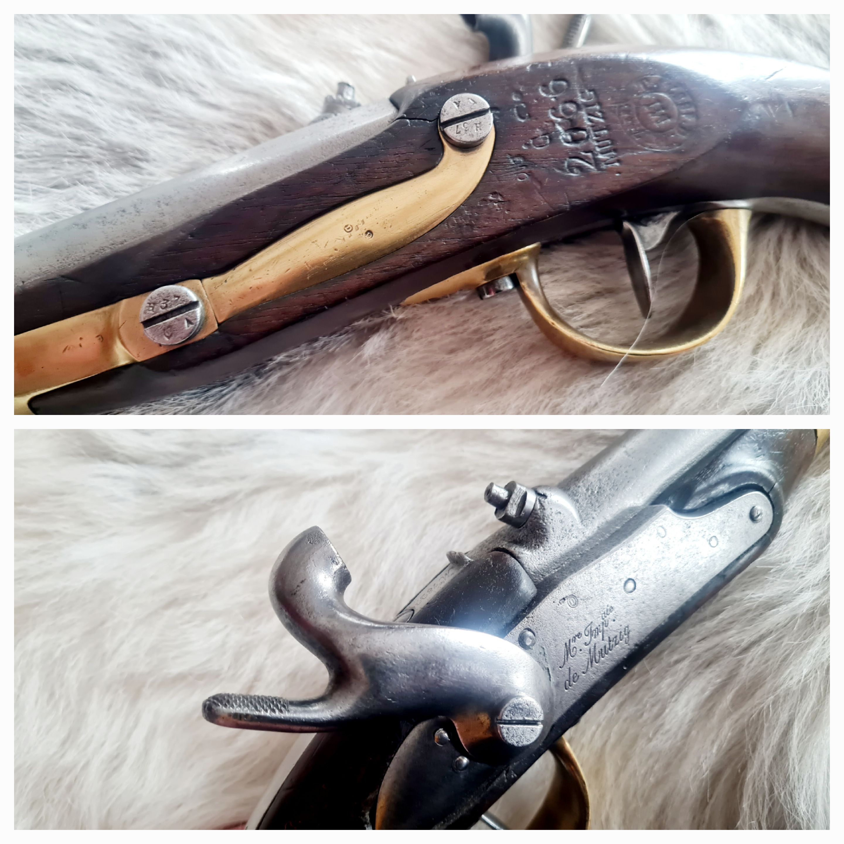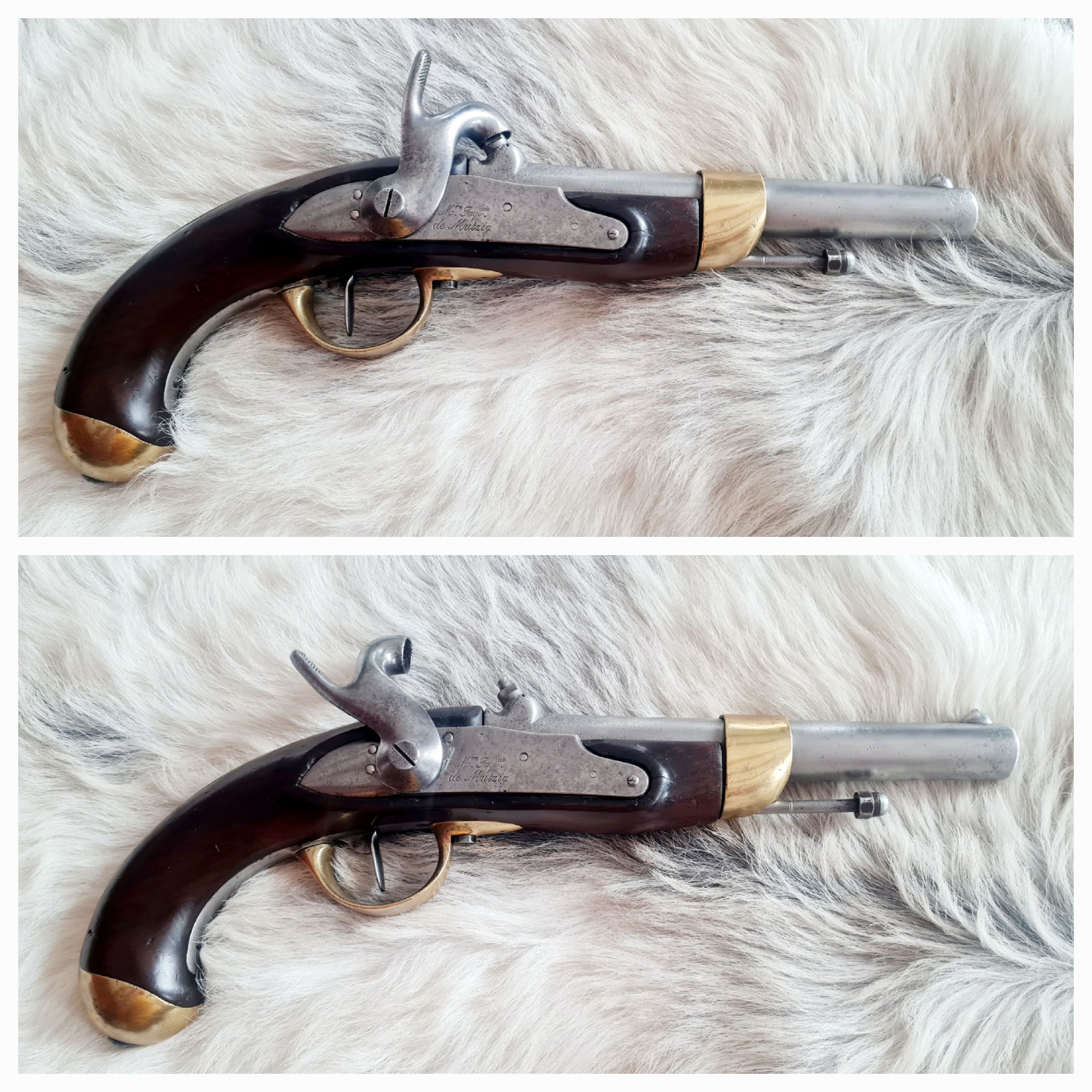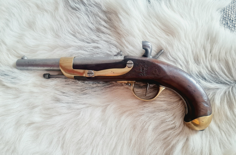 Französische Perkussionspistole M1822 in einem sehr guten Zustand. Kplt. mit Abnahmen. Schlossplatte mit Hersteller "Manufacture imperiale de Mutzig". Das Schloss rastet gut bzw. straff ein, die Feder hat ordentlich Druck. Die Pistole ist mehrfach gestempelt und wurde nicht "verputzt". Für Sammler in diesem Zustand ein interessantes, schönes Stück. Lediglich der Ladestock wurde nicht Orginal ergänzt. Versand ins Ausland bitte auf Anfrage, Porto weicht hier ab. Kein Verkauf an Mitglieder unter 5 Bewertungen. Privatverkauf daher keine Gewährleistung, Rücknahme oder Umtausch nach EU Recht für Gebrauchtwaren.