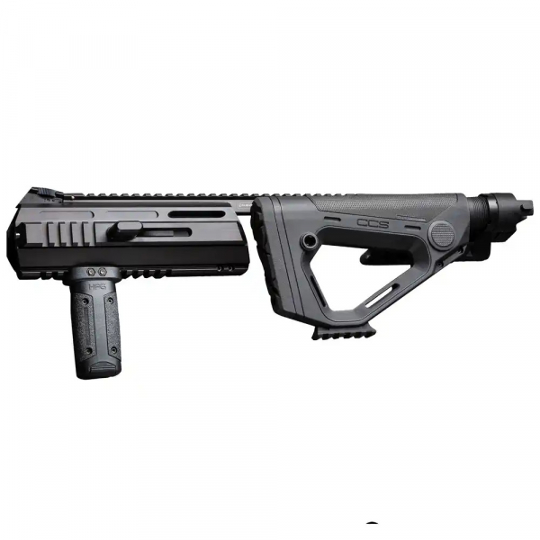 Der Umrüstsatz Hera Triarii RTU SFU Anschlagschaft. Der Name Triarii verweist auf das nunmehr dritte Schaftmodell von HERA und ist inspiriert von der römischen Eliteeinheit “Triarier“. Der Triarii bietet eine hoch ergonomische Plattform, die speziell auf die Bedürfnisse von Sportschützen zugeschnitten ist. Picatinny-Schienen sowie die Möglichkeit AR15 Schäfte zu montieren, erlauben hohe Modularität. Mit der Einstellbarkeit des Winkels am Hinterschaft lässt sich auch mit Helm oder Gehörschutz ein fester und bequemer Anschlag einnehmen. Das Verschlusssystem sowie der integrierte Durchladehebel erlaubt die Montage der Basiswaffe innerhalb von wenigen Sekunden. Das Triarii RTU - Ready to use Package kommt mit HFG Vordergriff sowie einem montierten CCS Hinterschaft und der Side Folding Unit.