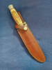 Französisches Jagdmesser aus den 60er/70er Jahren, überarbeitet und rasiermesserscharf geschliffen. Kein Vitrinenstück, eher ein gutes Gebrauchsmesser. Klinge ca. 17,7 cm, Ges. 28,2 cm - Das Herstellerlogo "Weintraube" und "Made in France" ist noch schwach zu sehen, eine passende solide Lederscheide ist dabei