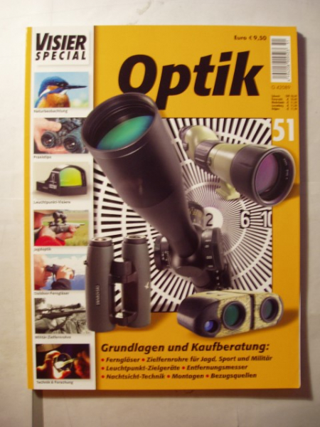 ür Schützen und Jäger :+++ angeboten wird das VISIER - SPEZIAL Nr. 51 -- ** OPTIK ** -- Grundlagen und Kaufberatung - mit Themen zu -- Ferngläser -- Zielfernrohre für Jagd, Sport und Militär -- Leuchtpunkt Zielgeräte -- Entfernungsmesser -- Nachtsicht Technik-- Montagen -- Bezugsquellen ++ Es ist ein Band - mit 115 Seiten - von 2008. +++ Das Heft ist gebraucht ; befindet sich aber in einem sehr guten Zustand +++ Der Versand erfolgt als Großbrief mit DHL (unversichert) ; die Versandkosten gelten nur für Deutschland.+++ Bieter aus dem Ausland bitte Versandkosten vor Gebot erfragen.+++ Versandrabatt möglich, sehen Sie auch meine anderen Angebote.+++ Privatverkauf, daher keine Gewährleistung, Garantie oder Rücknahme.+++ Fragen bitte mailen.