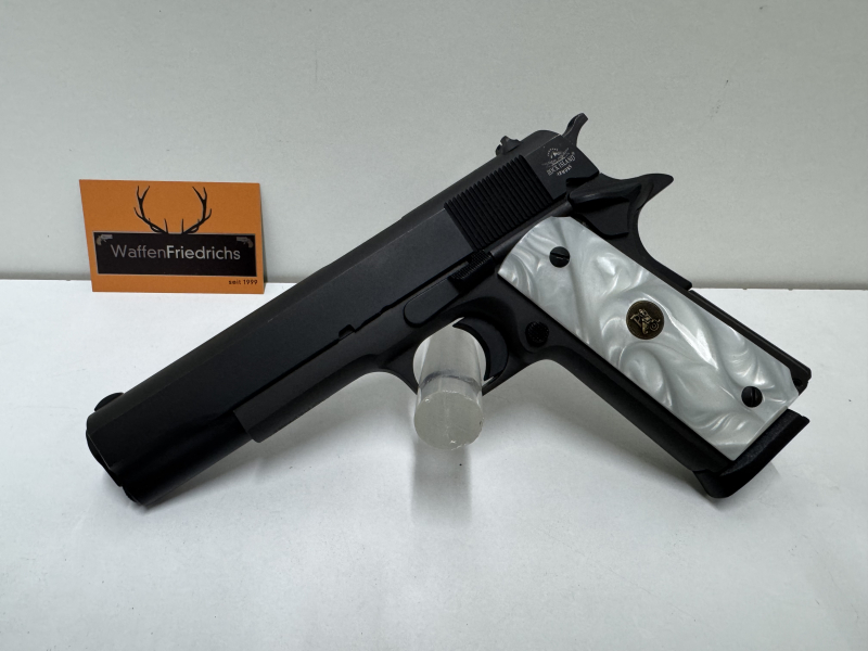 Die Firma Rock Island Armory / ARMSCOR ist ein solider Hersteller von Pistolen der 1911er Baureihe und hat sich auch auf dem europäischen Markt einen anerkannten Namen erarbeitet! Massive Pistolen mit bulligen Läufen und sehr guter Verarbeitung lassen fast keine Wünsche mehr offen. Das Modell G.I Entry präsentiert sich hier als die klassische 1911 A1 mit schönen Griffschalen in Perlmuttoptik! Die richtige Wahl für alle, die dem Einheitsbrei der Kunststoffwaffen keine Aufmerksamkeit schenken wollen, sondern eine .45er im "old fashioned Style" bevorzugen. Die Waffe stammt aus einem Jägernachlass und scheint ungeschossen zu sein. Der Lauf ist blitzblank und natürlich gibt es auch ein Reservemagazin dazu.