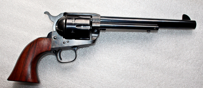 Sehr gut verarbeiteter Revolver mit Bunthärtung. Nur wenig geschossen. Mit spiegelblanken 7,5" langen Lauf. Seitliche Ladeklappe. Trocken stehender Abzug. Sehr gute Handlage. Sehr schöne blauschwarze Brünierung 99,9%.