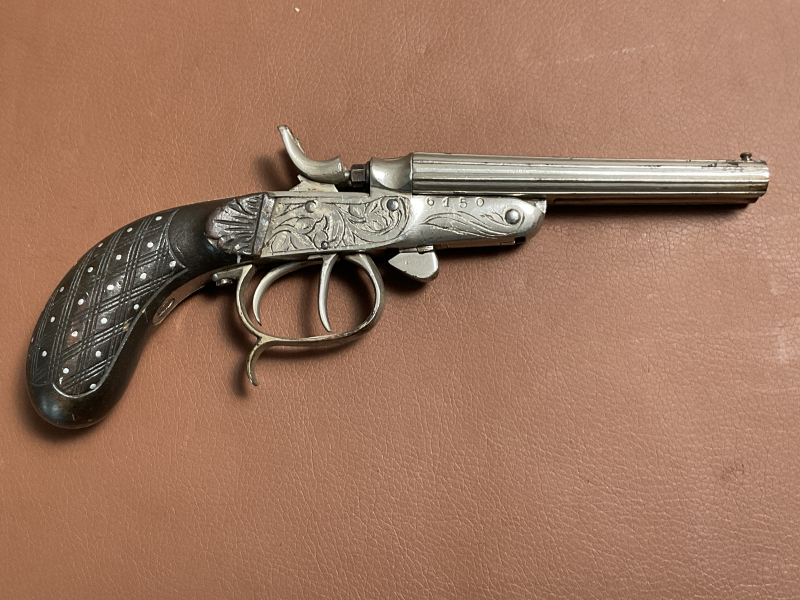 Zum Verkauf steht eine zweiläufige Kipplaufpistole im Kaliber .32Gartucha. Der Lauf ist blank mit stark ausgeprägten Zügen und Feldern.