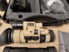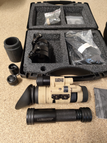 Außerdem verschiedene Einschalter für das Nachtsichtgerät und den Laser, Fest-Montage für das Zielfernrohr oder aus Gummi zum Stecken, Originalkoffer, Hartcase, 2 Ersatzlinsen, Trageriemen, Putztuch, Datenblatt der Röhre.