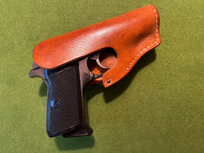 sicher getragen werden. Aus hellbraunem, formstabilen Leder, geschlossen am Laufund eben "open top" ohne obigen Verschluss, die Einsparung für den Gürtel ist gute 65mm. breit. Inhalt auf den Beispielbilder sind einmal ein Modell der dafür gedachten Waffe, die PPK hier wieder von vorne