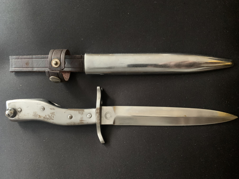 Sehr seltenes Seitengewehr…es wurde gleichzeitig als Grabendolch entwickelt…Scheide und Griff aus Metall die ursprüngliche Farbe lässt sich nur erahnen das Metall ist eigentlich komplett blank berieben.