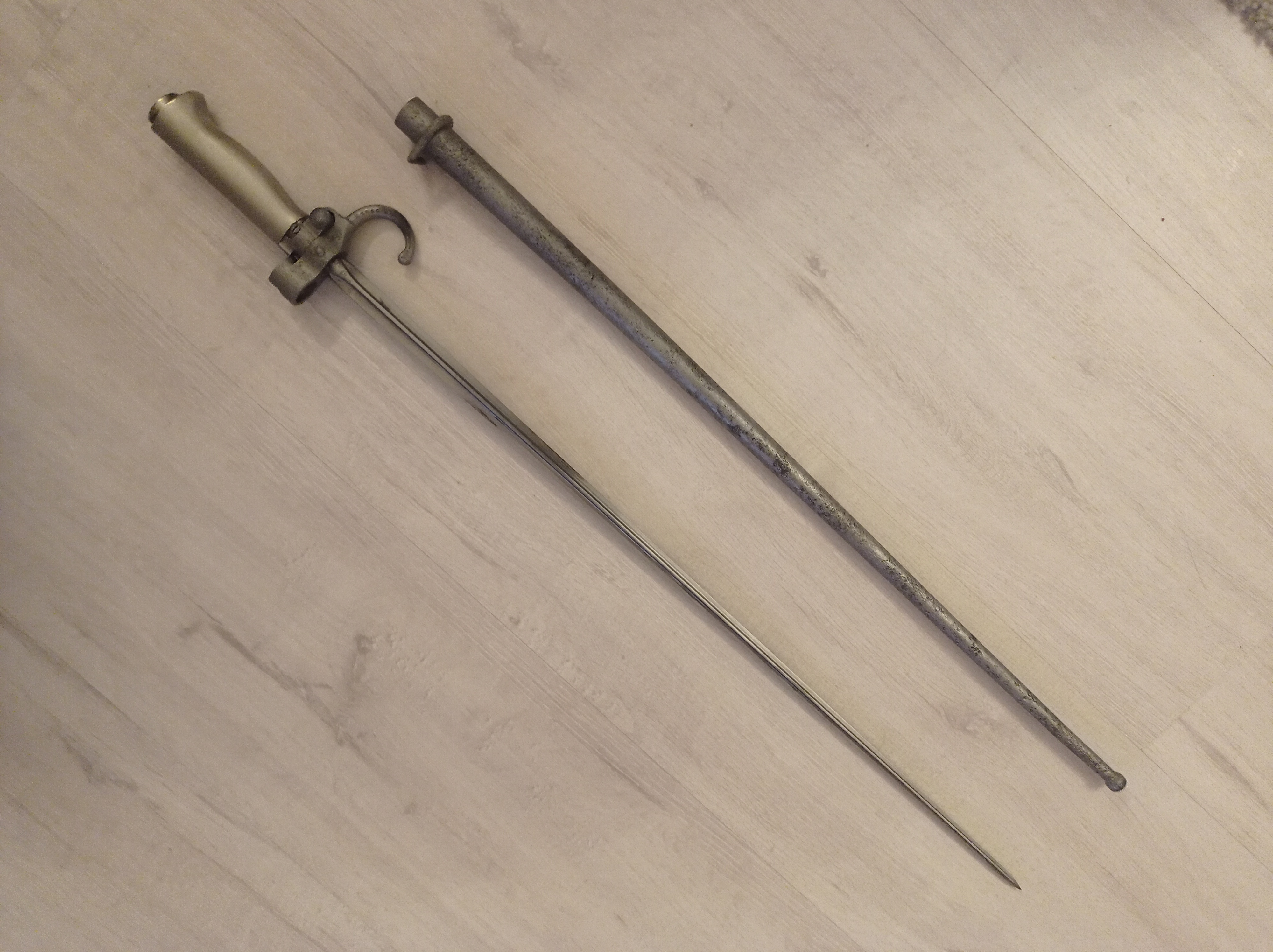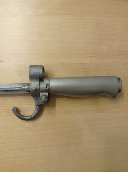 Das angebotene Lebel Bajonett M1886 ist in top Zustand, die Klinge in kreuzförmigem Querschnitt ist nahezu korrosionsfrei. Schneide ebenfalls sehr guter Zustand, sandgestrahlt. Der Griff ist aus Weißmetall (Neusilber), Griffbefestigung 2. Modell mit Verschraubung. Parierhaken, verwendet bis 1915 ist mit Nummer versehen. Klingenlänge 52 cm, ungekürzt. Arretierung leichtgängig. Hinweis: dies ist eine Privatauktion, jegliche Gewährleistung und Rücknahme ist ausgeschlossen. Eine Besichtigung des Artikels ist möglich, ebenso Abholung gegen Barzahlung. Ansonsten Versand gegen Vorkasse.