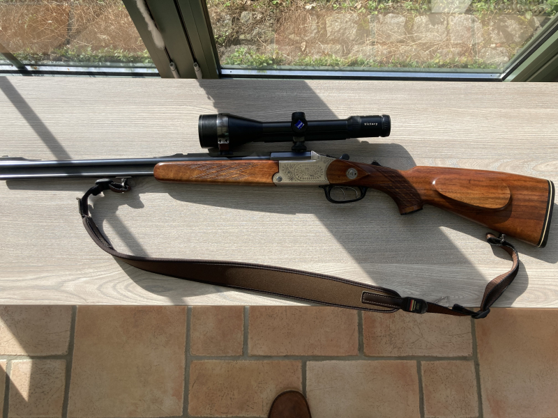 Für einen Jagdfreund versteigere ich einen Blaser Bergstutzen im Kaliber .30-06 und 5,6x50R Magnum. Die Waffe ist seit über 20 Jahren in seinem Besitz und wurde von ihm wenig geführt, sie ist in einem technisch einwandfreien Zustand und gutem Gesamtzustand mit einigen Gebrauchsspuren siehe Bilder, die Läufe sind blank. Einschloß-Handspannung, vorderes Abzugszüngel mit Rückstecher, System dicht und ohne Spiel. Die Lauflänge beträgt 56cm, Schaftlänge 37cm, Gesamtlänge 99cm.Zielfernrohr Zeiss Diavari M 3-12x56 T mit -4er Leuchtabsehen auf Schwenkmontage. Da es sich um einen Privatverkauf handelt ist weder Garantie noch Umtausch oder Rücknahme möglich.