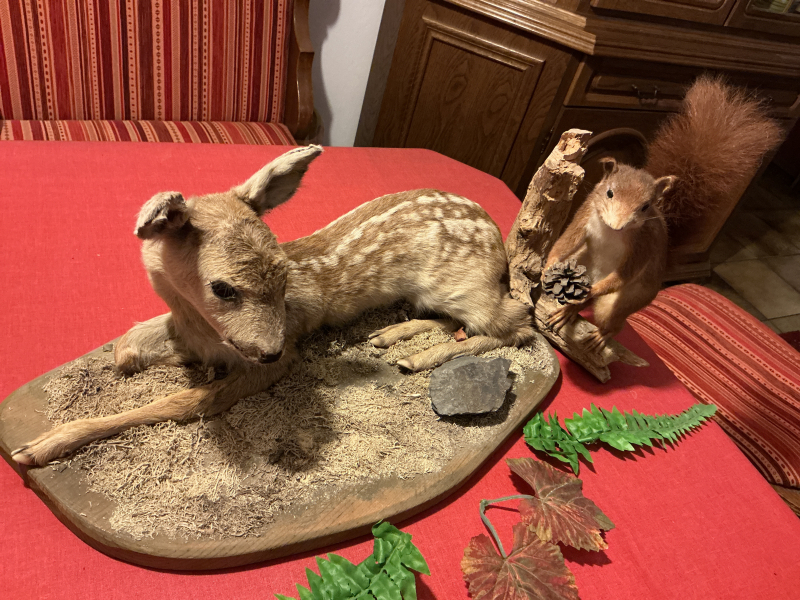 Das präparierte Rehkitz ist auf einer Holzplatte liegend.