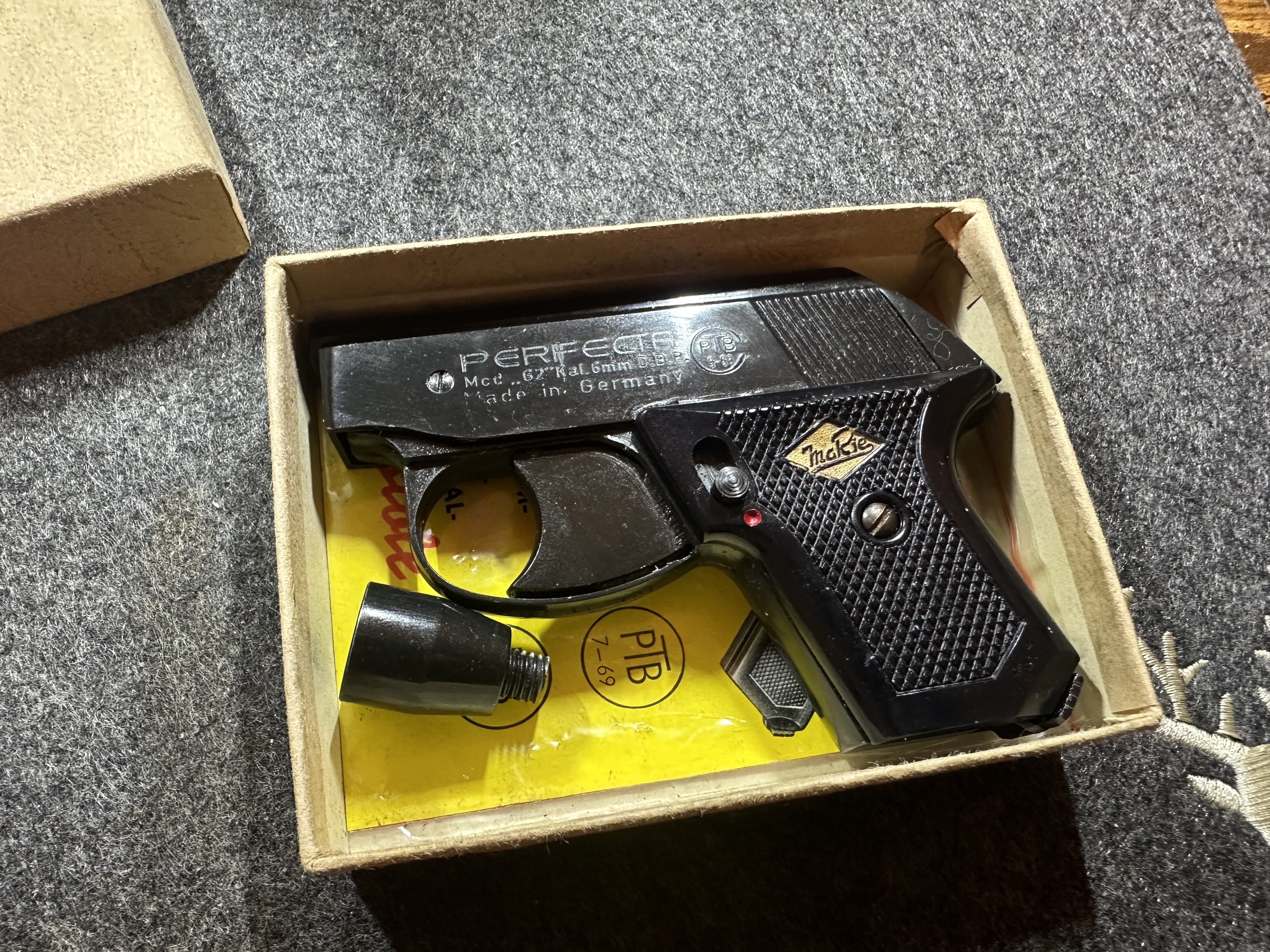 Die Waffe wird in der vermutlich originalen Verpackung geliefert, inklusive Bedienungsanleitung und Signalbecher.