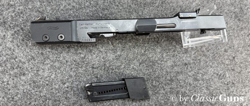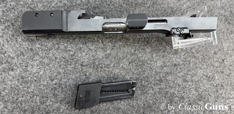 Äußerlich sind Gebrauchs- und Handhabungsspuren erkennbar. Technisch sind das Wechselsystem sowie das zum Lieferumfang gehörende 5er-Magazin einwandfrei, der 4,5“ Lauf verfügt über ein neuwertiges Zug-/ Feldprofil.