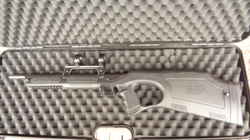 Walther G22 SL-Büchse schwarz, Kaliber 22lr, Gesamtlänge 71 cm, Lauflänge: 50 cm mit 30mm Ringmontage. Doppelseitige Sicherung, herausnehmbares 10-Schuss Magazin & Ersatzmagazin im Schaft. Kunststoffschaft mit Gummischaftkappe und allem Zubehör siehe Foto inklusive Walther Koffer.