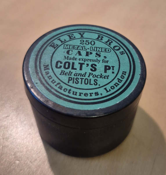 Original Colt Zündhütchendose von Eley London aus der 2. Generation der Colt Blackpowder Revolver aus den 1970er Jahren. Die Dose ist neu, hat nur leider ein paar Lagerspuren