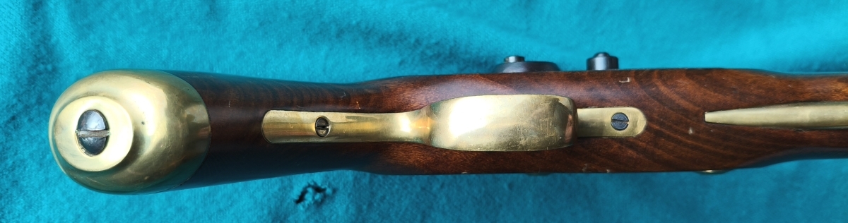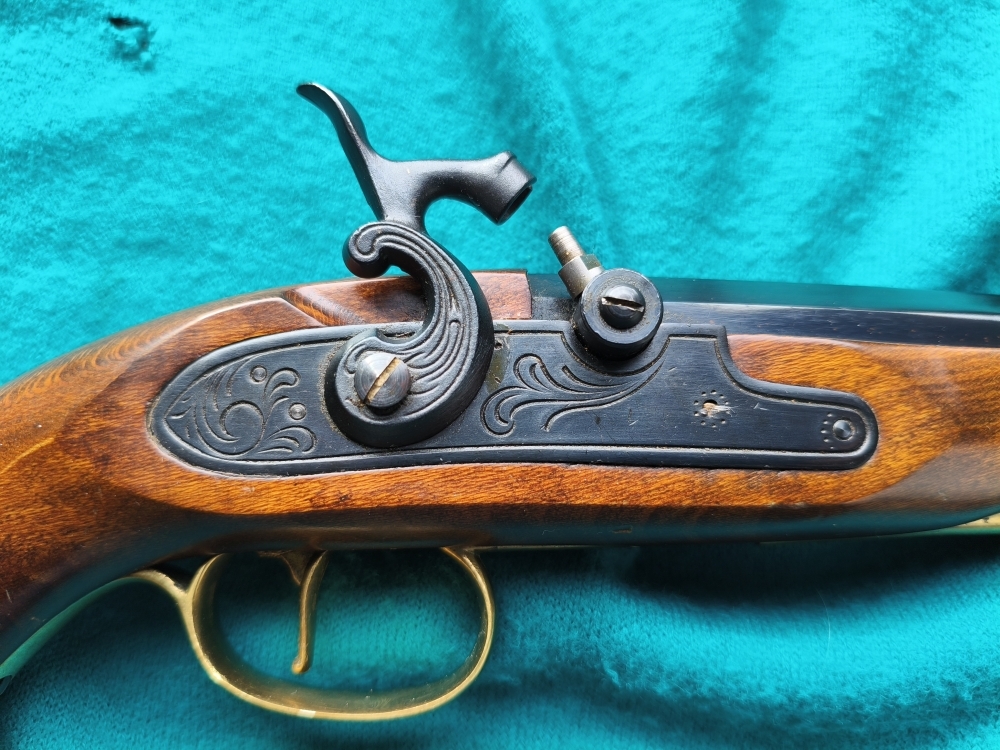 Gebläuter achtkantiger in rund übergehender massiver Lauf, seitlich Beschuss, angesenkte Mündung, Kal. 45 gezogen. Verziertes Perkussionsschloß mit zwei Rasten. Schön gemaserter Nussholzschaft. Messingbeschläge. Eiserner nach vorne gemuldeter Ladestock. Gesamtlänge 39,5cm.