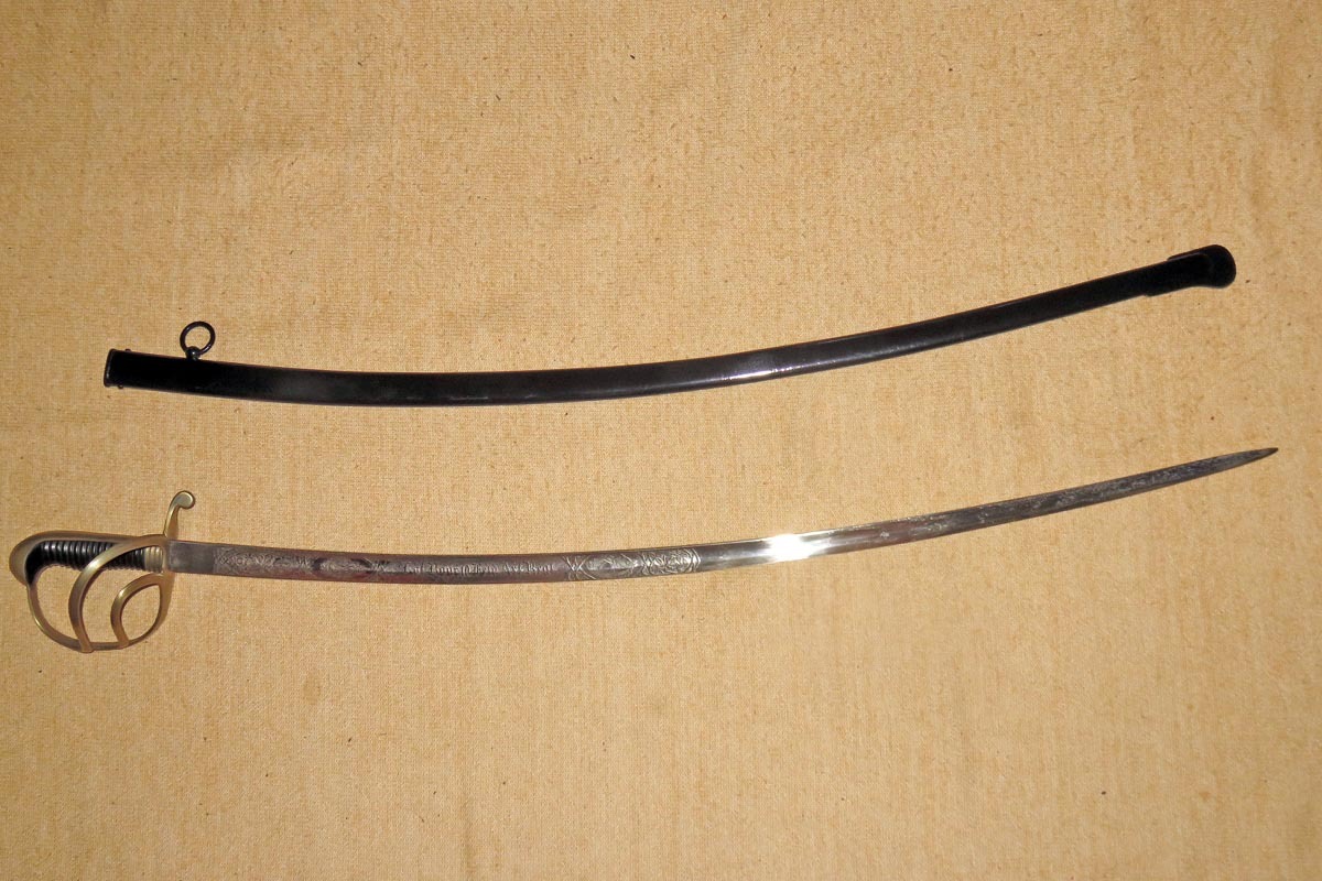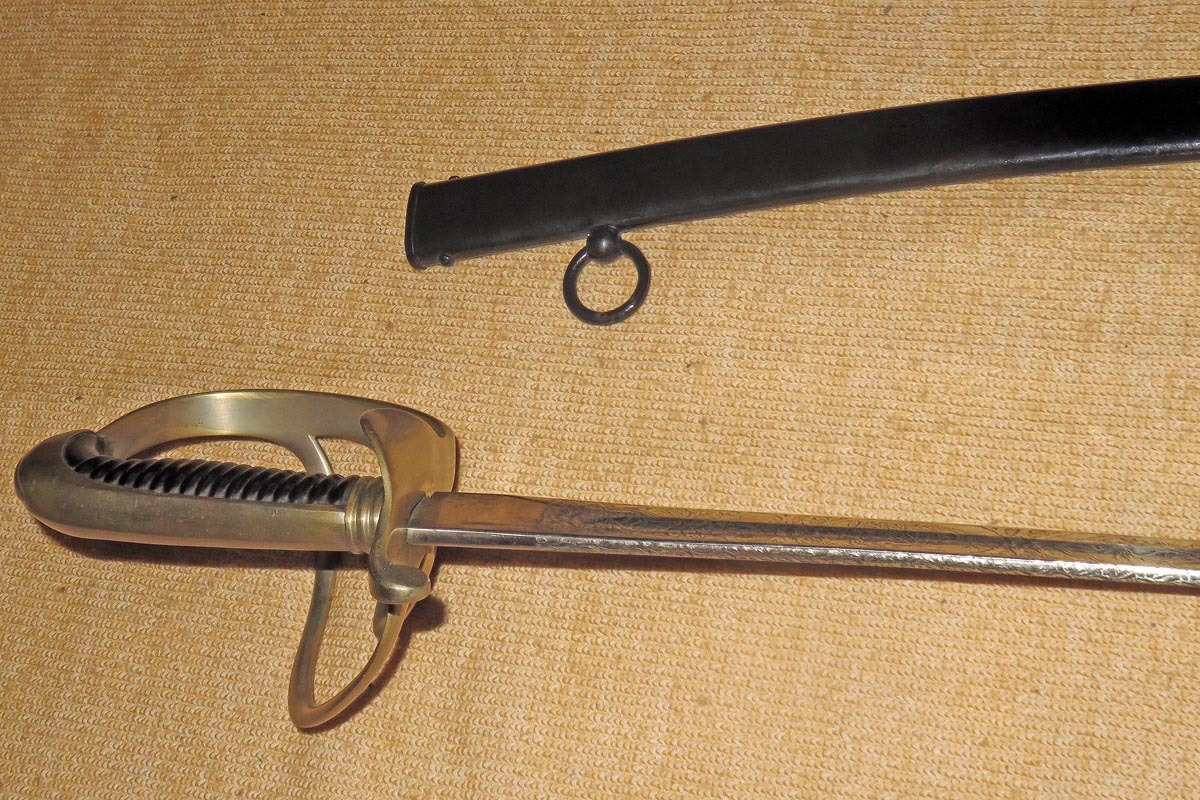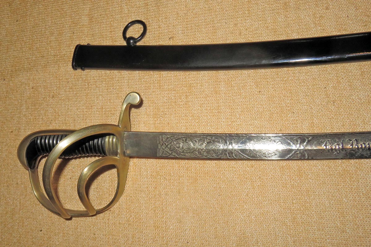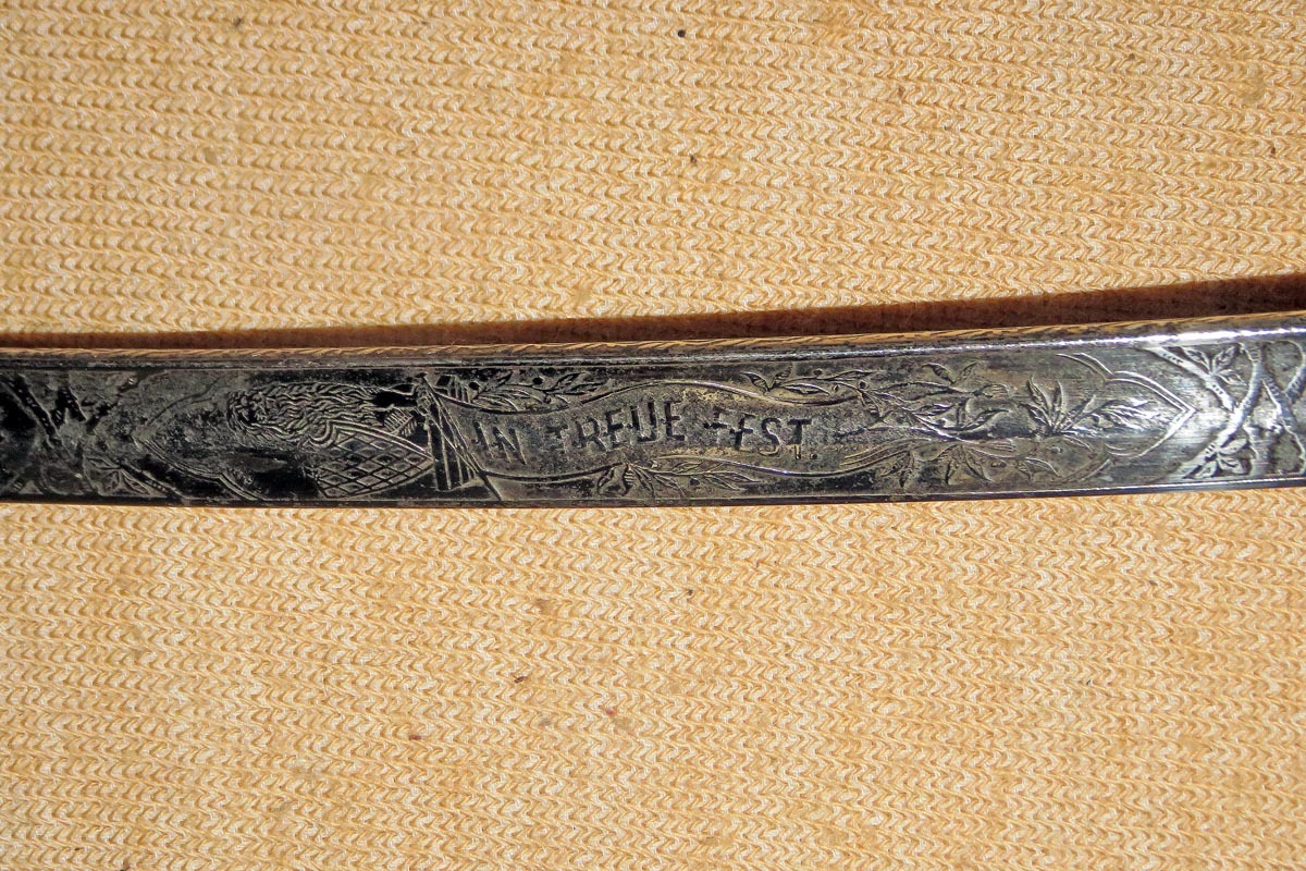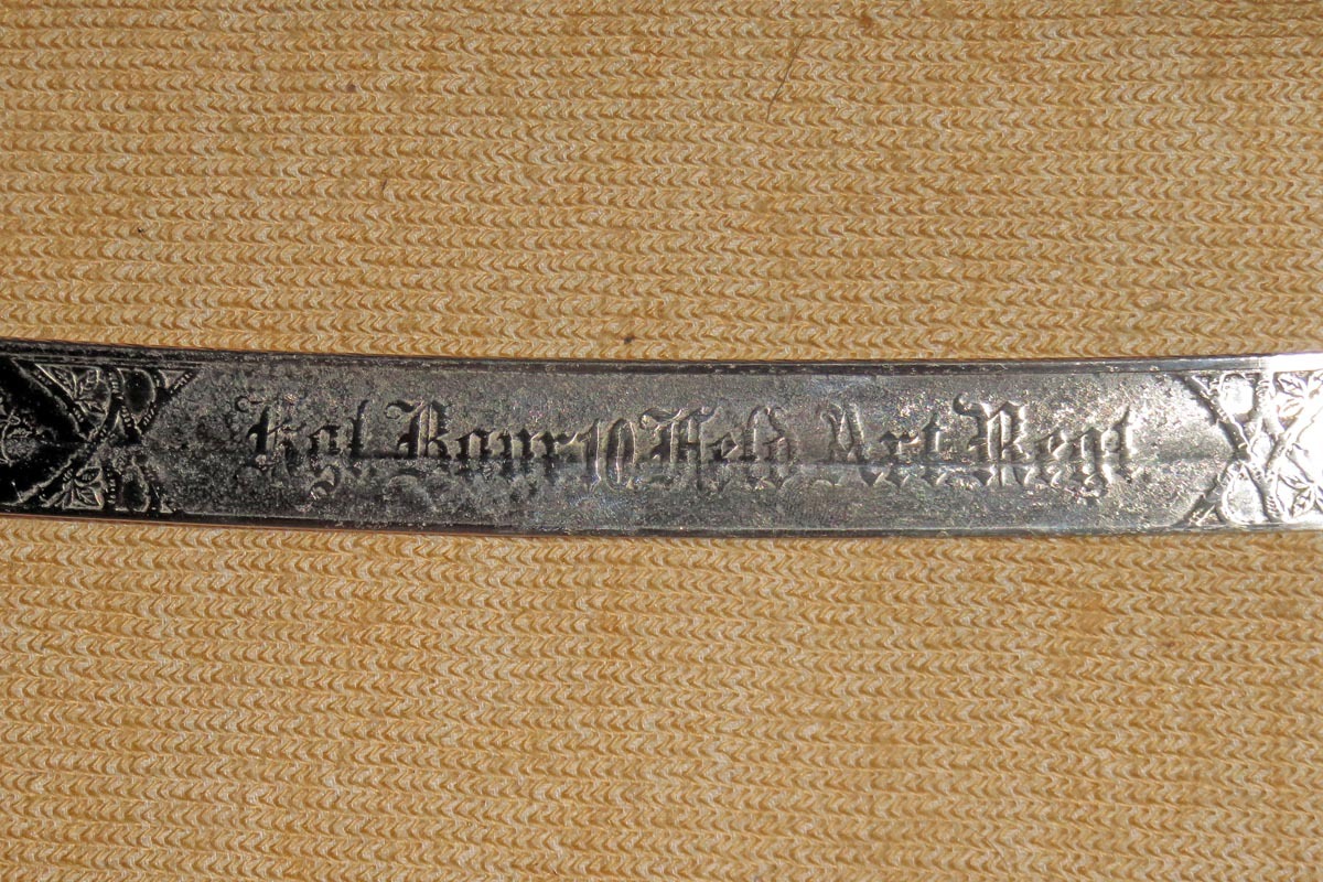 Säbel der bayerischen Feldartillerie mit dreispangigem Gefäß und gerippten Bakelitgriff, Stahlscheide mit einem Ring und aufwendig beidseitig geätzte Klinge (Ornamentik, Trophäenmuster und Inschrift „IN TREUE FEST“ „ Kgl. Bayr. 10. Feld Art. Regt.“) siehe Bilder, keine Marke.