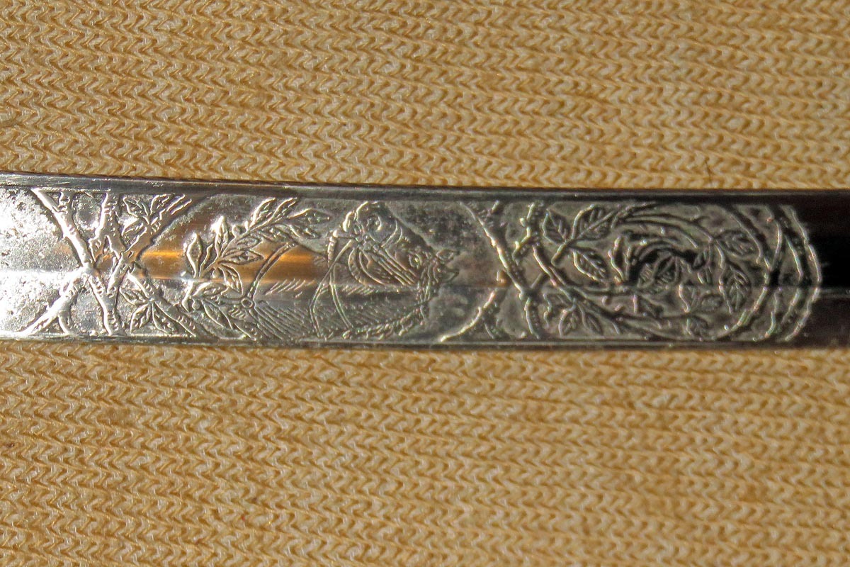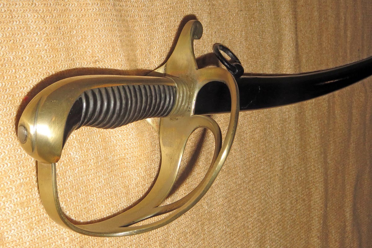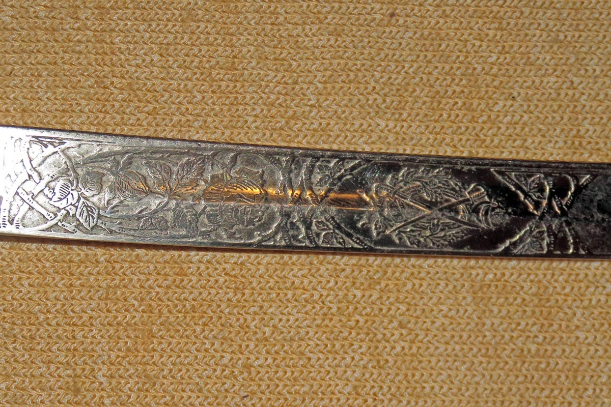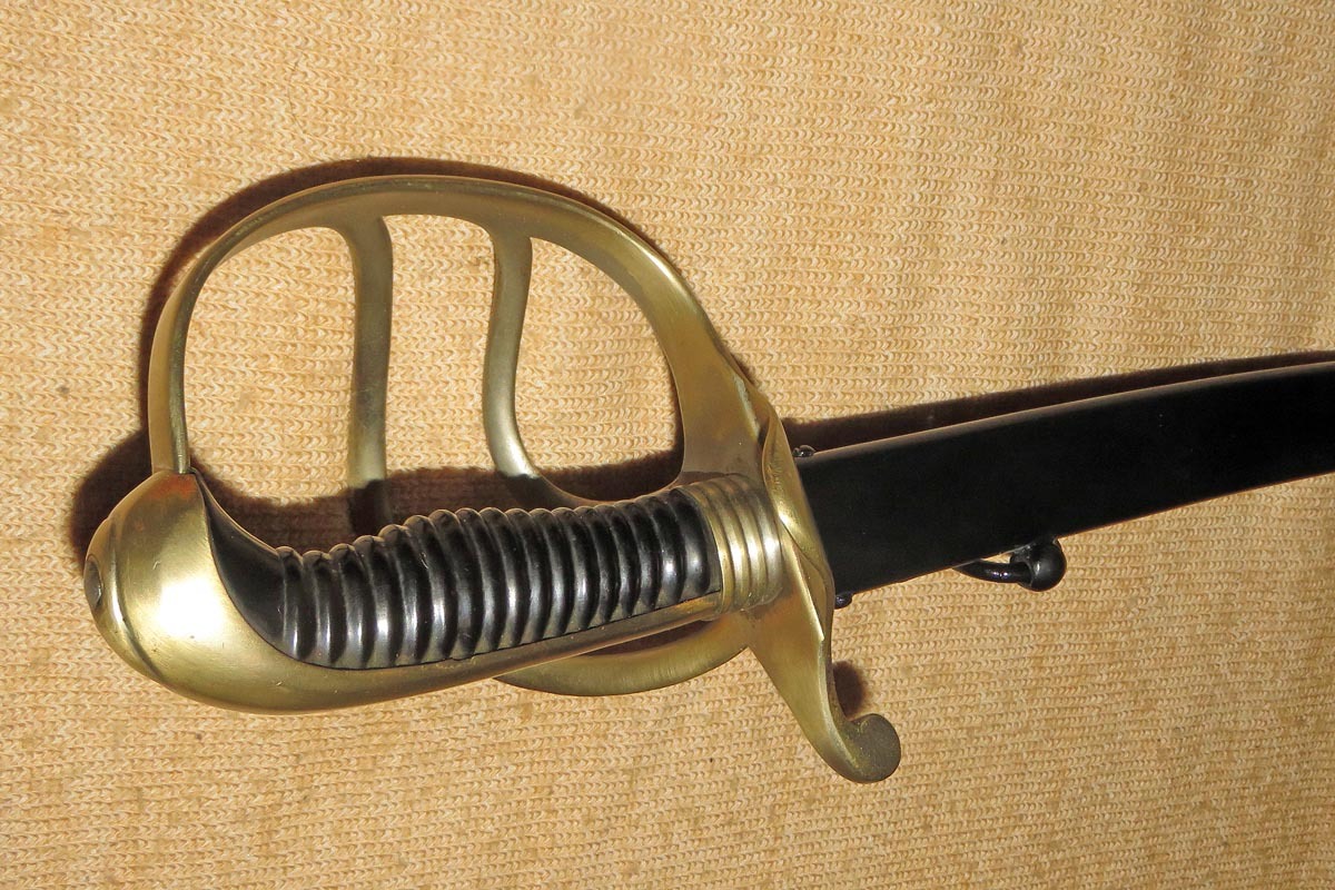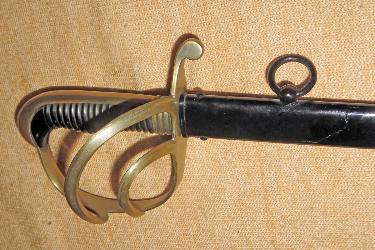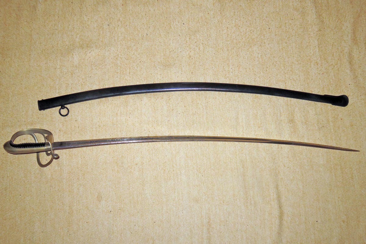 Säbel der bayerischen Feldartillerie mit dreispangigem Gefäß und gerippten Bakelitgriff, Stahlscheide mit einem Ring und aufwendig beidseitig geätzte Klinge (Ornamentik, Trophäenmuster und Inschrift „IN TREUE FEST“ „ Kgl. Bayr. 10. Feld Art. Regt.“) siehe Bilder, keine Marke.