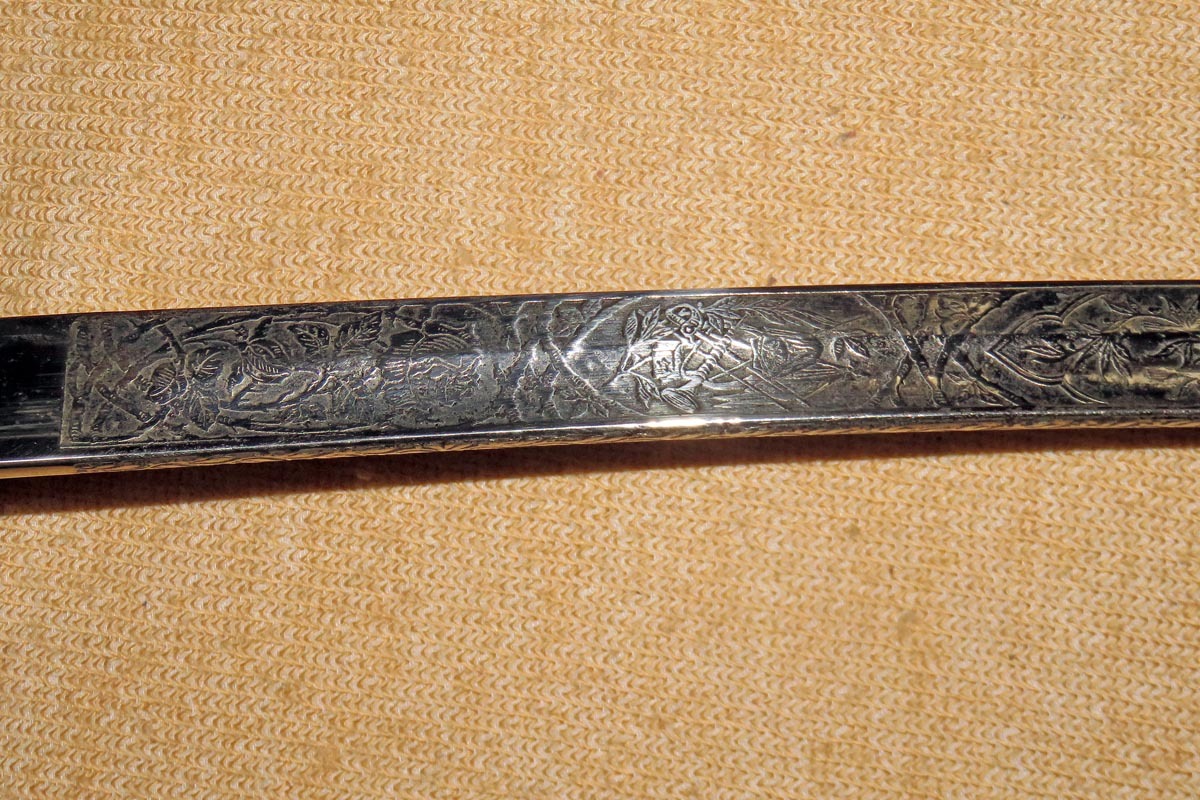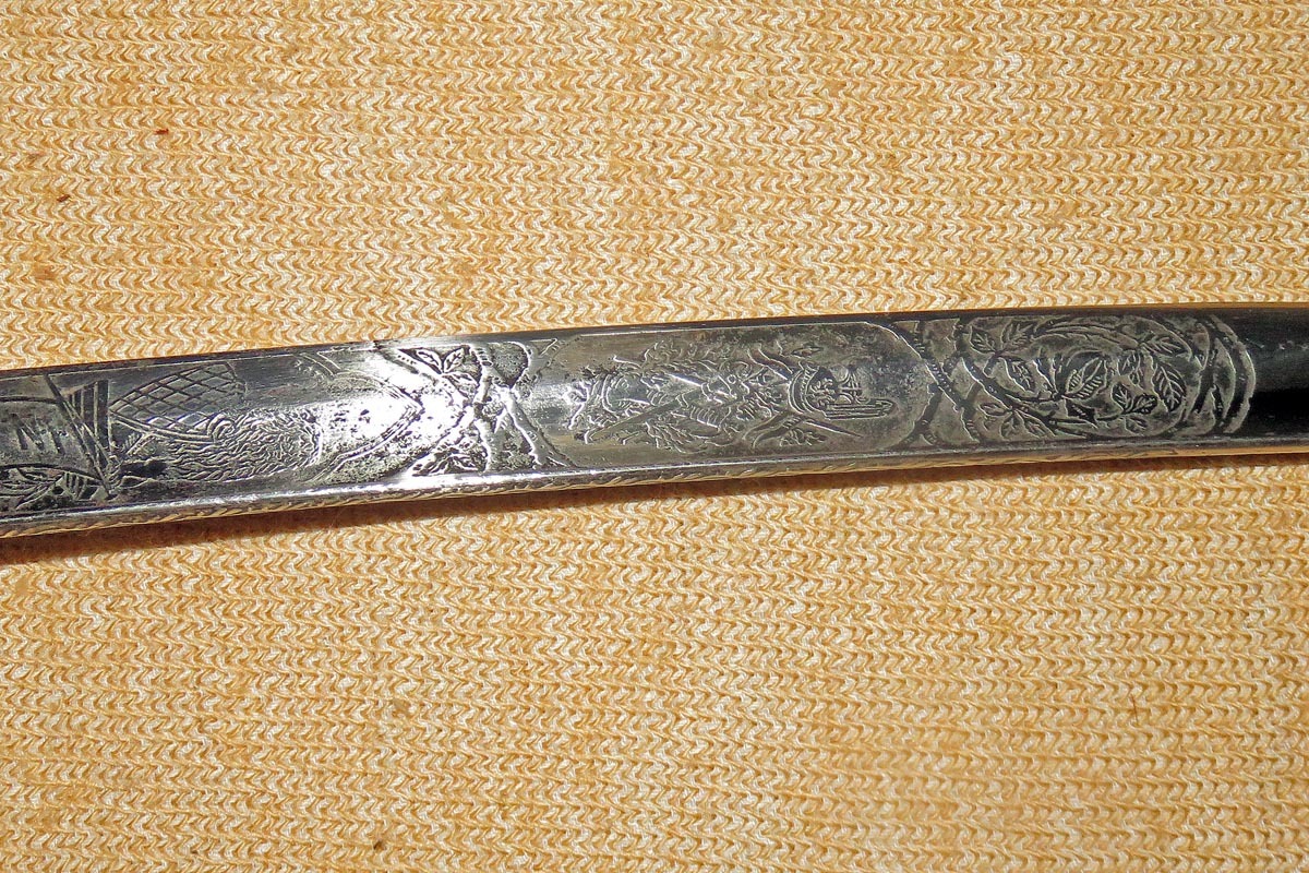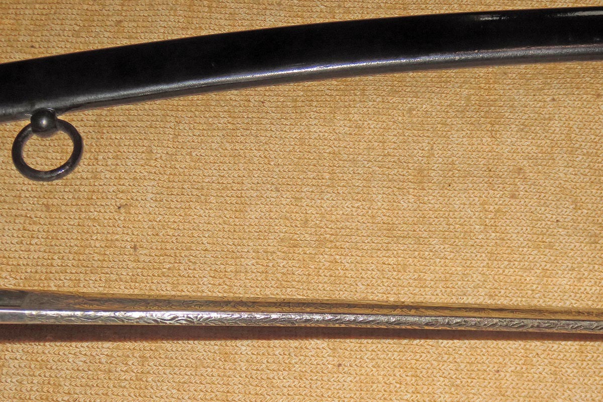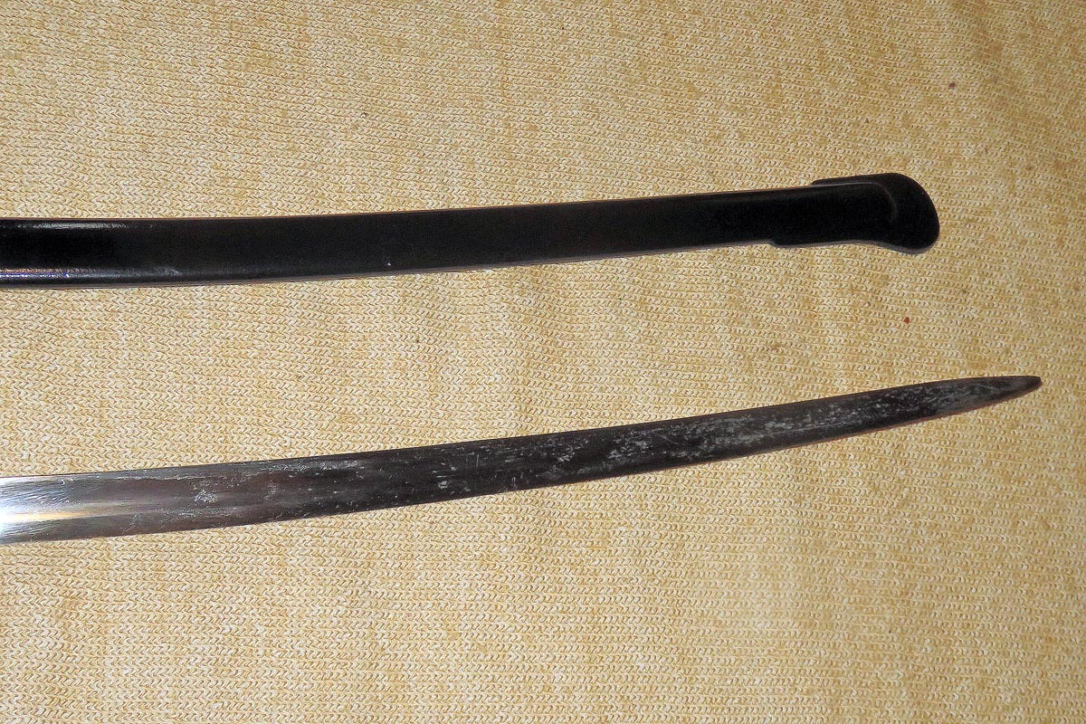 Originalstück mit Gebrauchsspuren, kleine Rostnarben an der Spitze, Scheide nach geschwärzt.