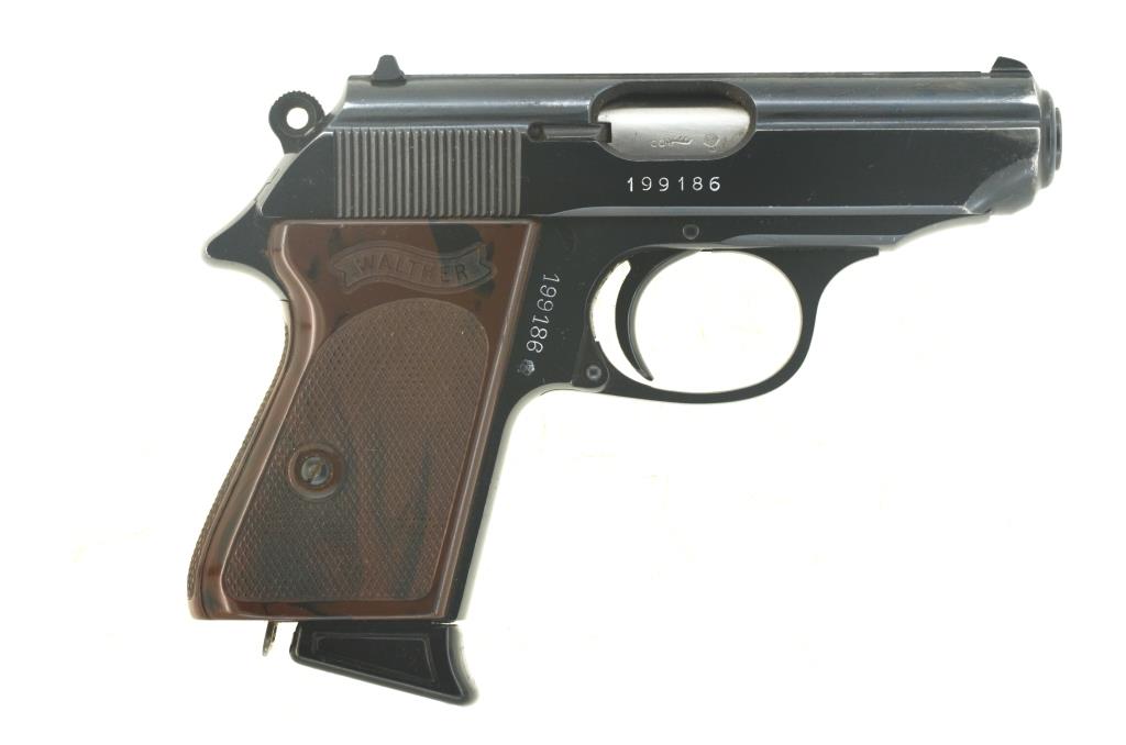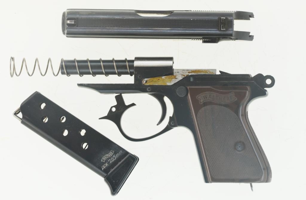 Kaliberangabe, Herstellerschriftzug, Walther-Banner, „Modell PPK“, Seriennummer, bundesrepublikanische Beschusszeichen "Adler über N", datiert "66".