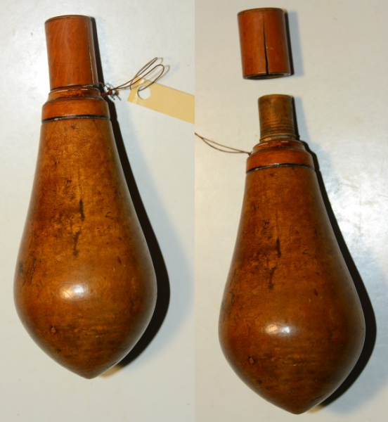 Pulverflasche aus gedrechseltem Holz, 15,5 cm hoch, im Schraubdeckel ein alter Spannungsriss, ansonsten sehr guter Zustand