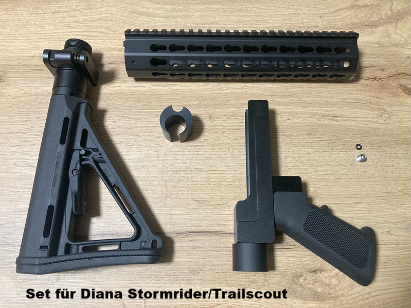 Angeboten wird ein taktisches Bodykit/Chassis in AR15-Optik, bestehend aus Griff-Einheit, Buffertube-Schulterstütze, und Keymod-Handschutzset. Passend für Diana Bandit, Chaser, Airbug, Stormrider und Trailscout, auch bekannt als Artemis/Snowpeak CP1, CP2, PP800, PR900 sowie Stoeger XM1. Das Kit verleiht dem Luftgewehr ein retro-militärisches Aussehen und erweitert die Möglichkeiten für Upgrades immens.