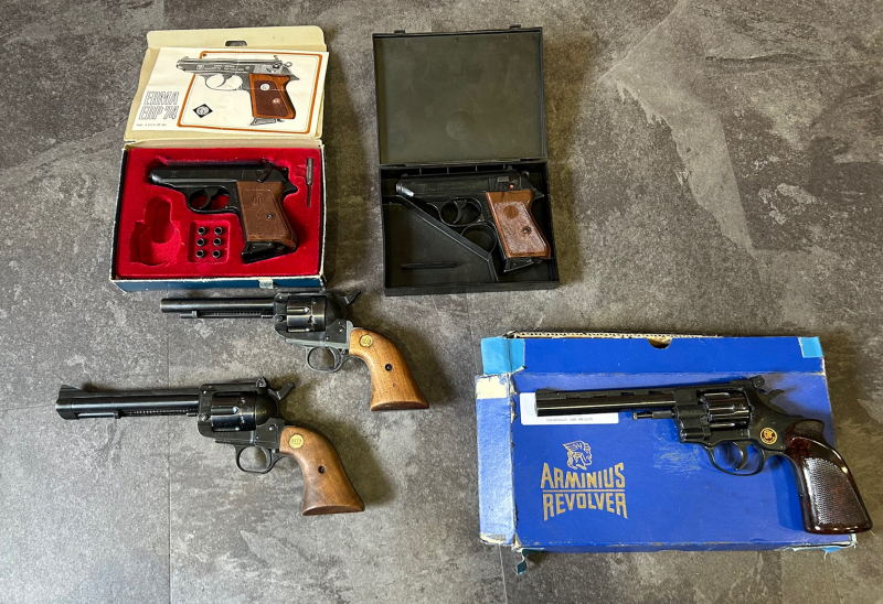 Konvolut von 4mm M20 Waffen: 2x Erma Pistolen Mod. ERP74 davon ist eine im Originalkarton mit Adapter Patronen und Beschreibung, 2x Reck Revolver in 4mm RZ (nicht M20) Mod. 12 und 14, 1x Arminius 4mm M 20 Mod. HW4/6 ------------wahrscheinlich nur für Händler oder Sammler--------------